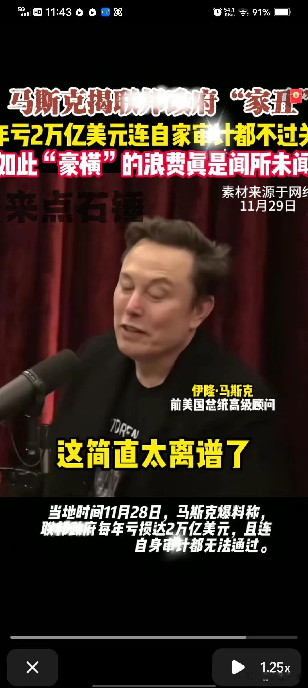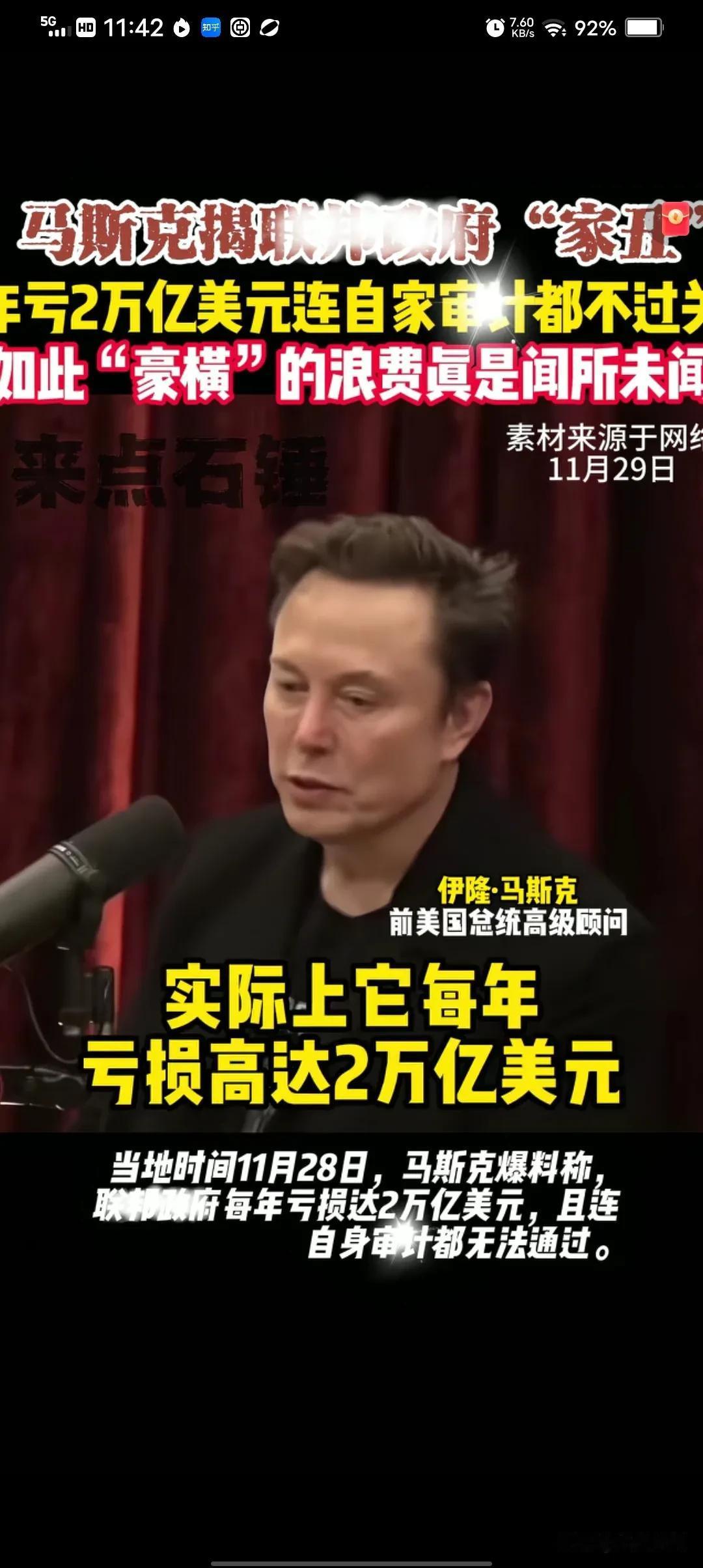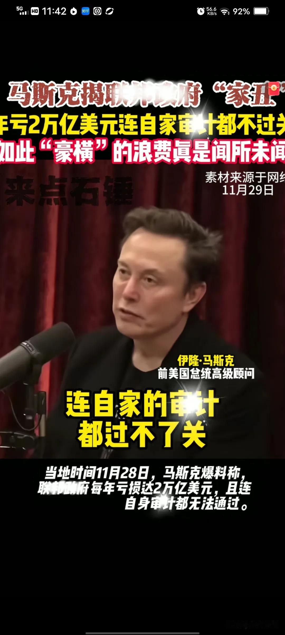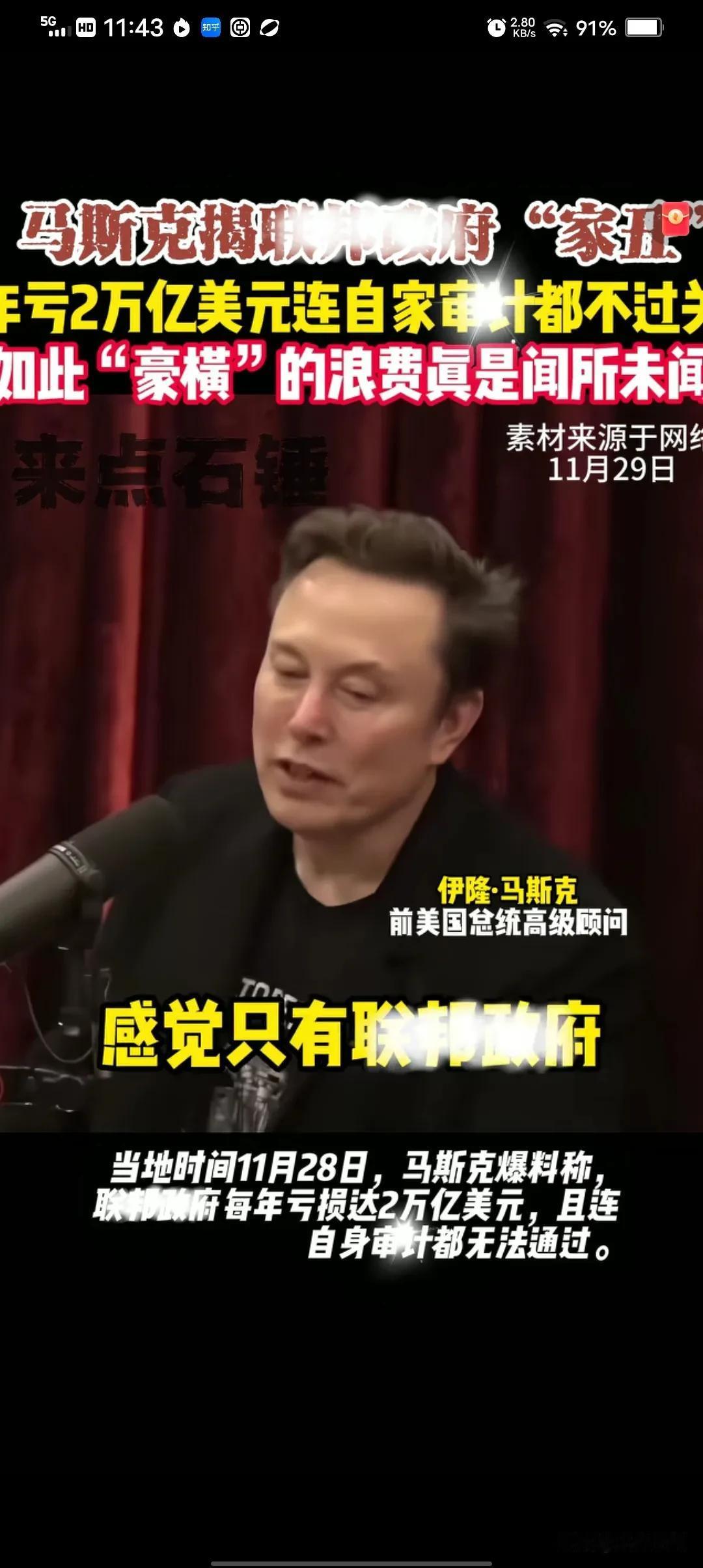 马斯克又揭美国联邦政府的看底,马斯克称美国联邦一年亏空高达2万亿美元,连自家的审计都通过不了,非常离谱,而且联邦政府非常肆无忌惮! 马斯克举了一个例子,就是有个议员组织拨款120亿美元给美军买潜艇,结果120亿美元拨过去了,潜艇一艘都没有看到,议员就组织听证会,问美国海军负责人,潜艇去哪了,美国海军负责人直接回答自己也不知道去哪了! 其实马斯克为什么帮川普查贪,最后查不下去了,其实就是查到五角大楼头上了,这里面的关系连川普都不敢得罪,马斯克根本就没有那个能力查得动,一年近万亿美元的军费,结果一年下水才几艘军舰,估计史密斯专员都不知道钱被谁拿走了!