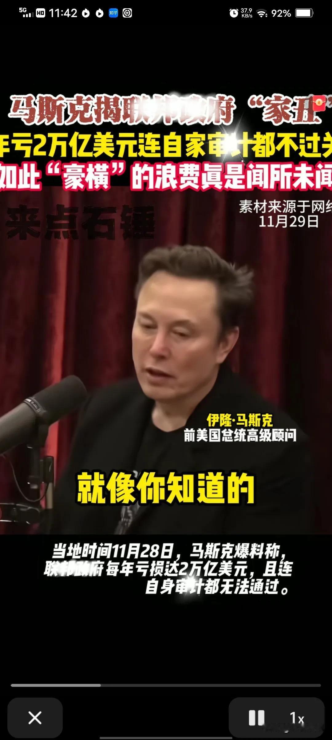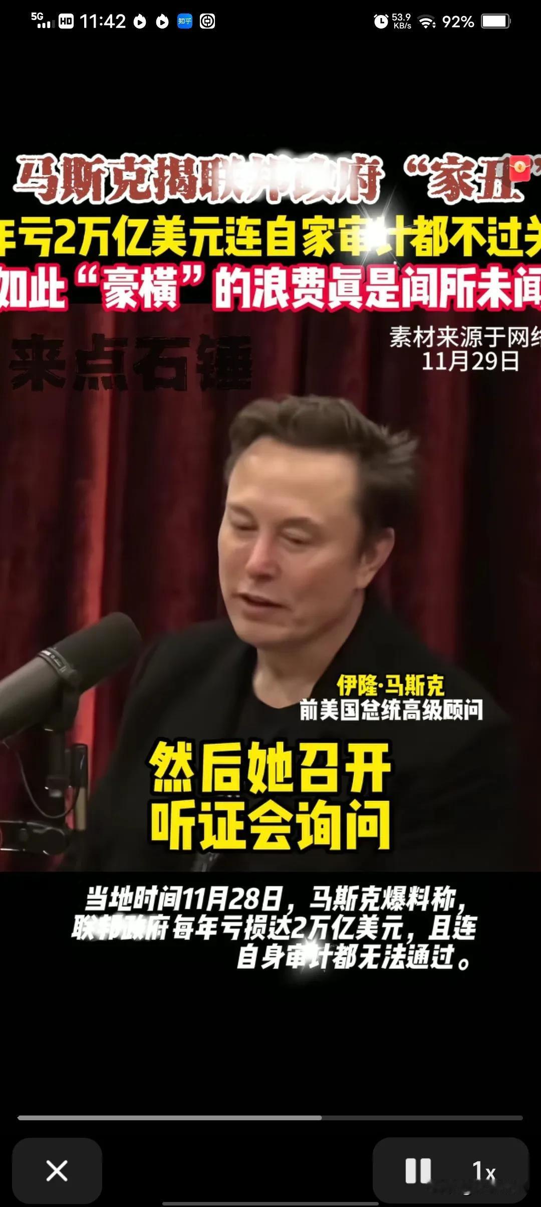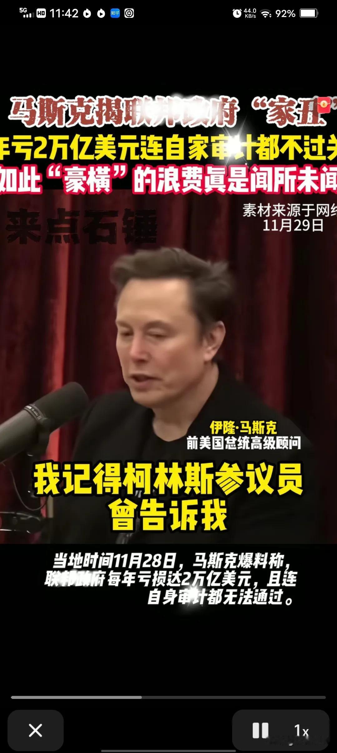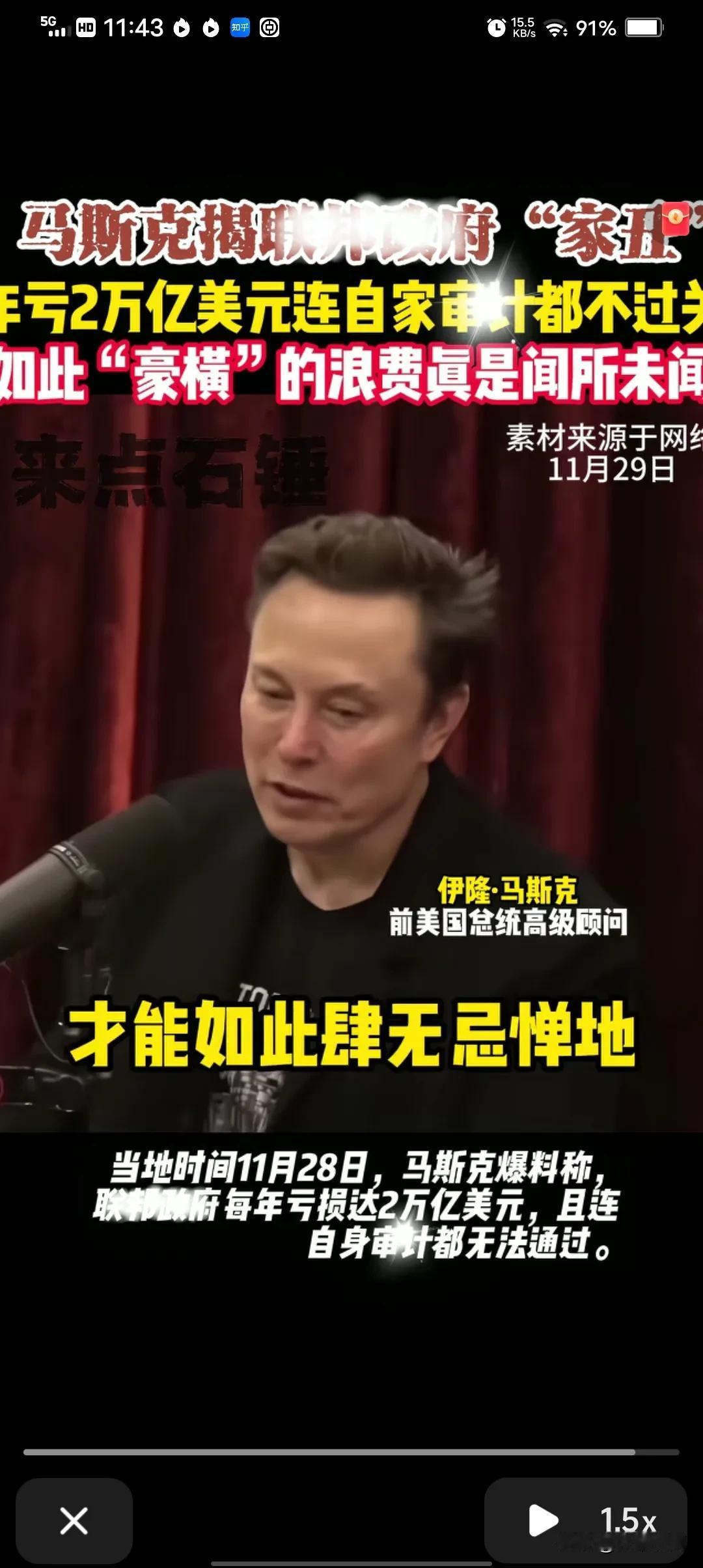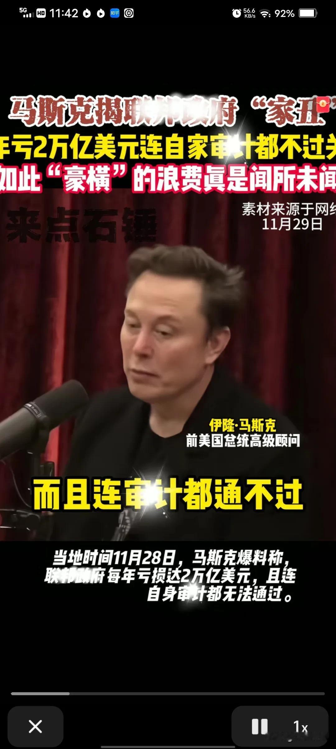 马斯克又揭美国联邦政府的看底,马斯克称美国联邦一年亏空高达2万亿美元,连自家的审计都通过不了,非常离谱,而且联邦政府非常肆无忌惮! 马斯克举了一个例子,就是有个议员组织拨款120亿美元给美军买潜艇,结果120亿美元拨过去了,潜艇一艘都没有看到,议员就组织听证会,问美国海军负责人,潜艇去哪了,美国海军负责人直接回答自己也不知道去哪了! 其实马斯克为什么帮川普查贪,最后查不下去了,其实就是查到五角大楼头上了,这里面的关系连川普都不敢得罪,马斯克根本就没有那个能力查得动,一年近万亿美元的军费,结果一年下水才几艘军舰,估计史密斯专员都不知道钱被谁拿走了!