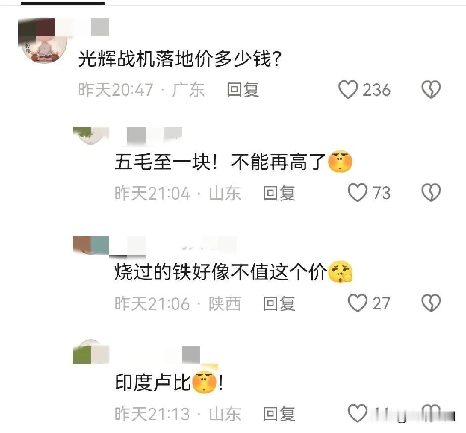 印度光辉战机是全世界最安全的,光辉战机的老板出来声明了,他说光辉战机绝对没有问题,要郑重地说明光辉战机是一款出色的战机,绝对安全,安全记录是全世界最佳的! 网友在评论区调侃,想问光辉战机的落地价多少,一斤五毛到一块钱之间,不能再多了! 其实不得不佩服印度人这种“厚脸皮”的精神,不管怎么打脸,依旧坚持自己是最好的,依旧坚持自己赢了,而且是发自内心的这么认为,一点都没有觉得羞耻,过了快40年研制的飞机,总共也就造了两架可以飞的,结果都摔了,还敢说光辉战机绝对安全!其实有时候我们就应该学习印度人的这种自信,我们反而太自卑,当然并不是说要盲目自信,而是多一点自信!