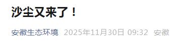 预计,11月30日傍晚开始,伴随冷空气传输影响,北方沙尘气团叠加上游滞留污染逐渐影响我省皖北区域,PM10浓度短时可能达到中度至重度污染水平;12月1日上午,我省逐渐转东北风,浮尘气团向沿江城市扩展迁移,短时可达轻度~中度污染;12月2日,受持续东北风影响,本次沙尘天气影响减弱。