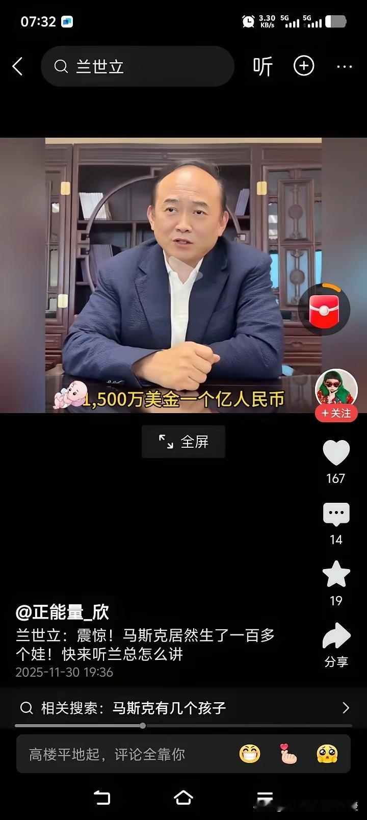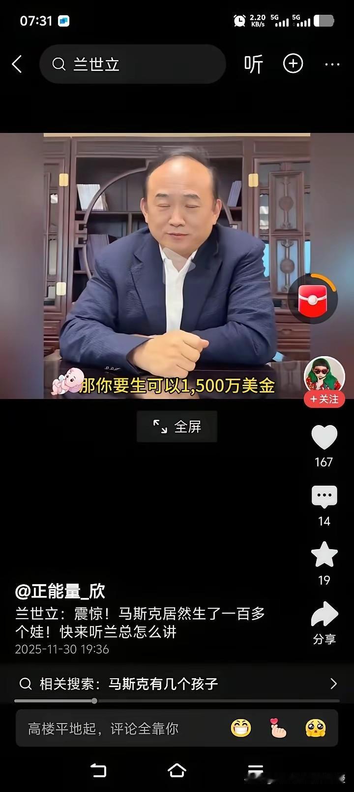 兰世立现在真的想抓住互联网流量博眼球啊!他爆料马斯克有一百多个孩子,1500万美金一个,生孩子共花了100多亿人民币。根据公开资料显示,马斯克跟四位女子有14个孩子。 如今马斯克身价3420亿美元,折合人民币2.4万亿,花,花100多亿人民币在他感觉估计就是100多块的既视感。要是兰世立说的是真的,那马斯克真的是凭一己之力在挽救地球的出生率啊!