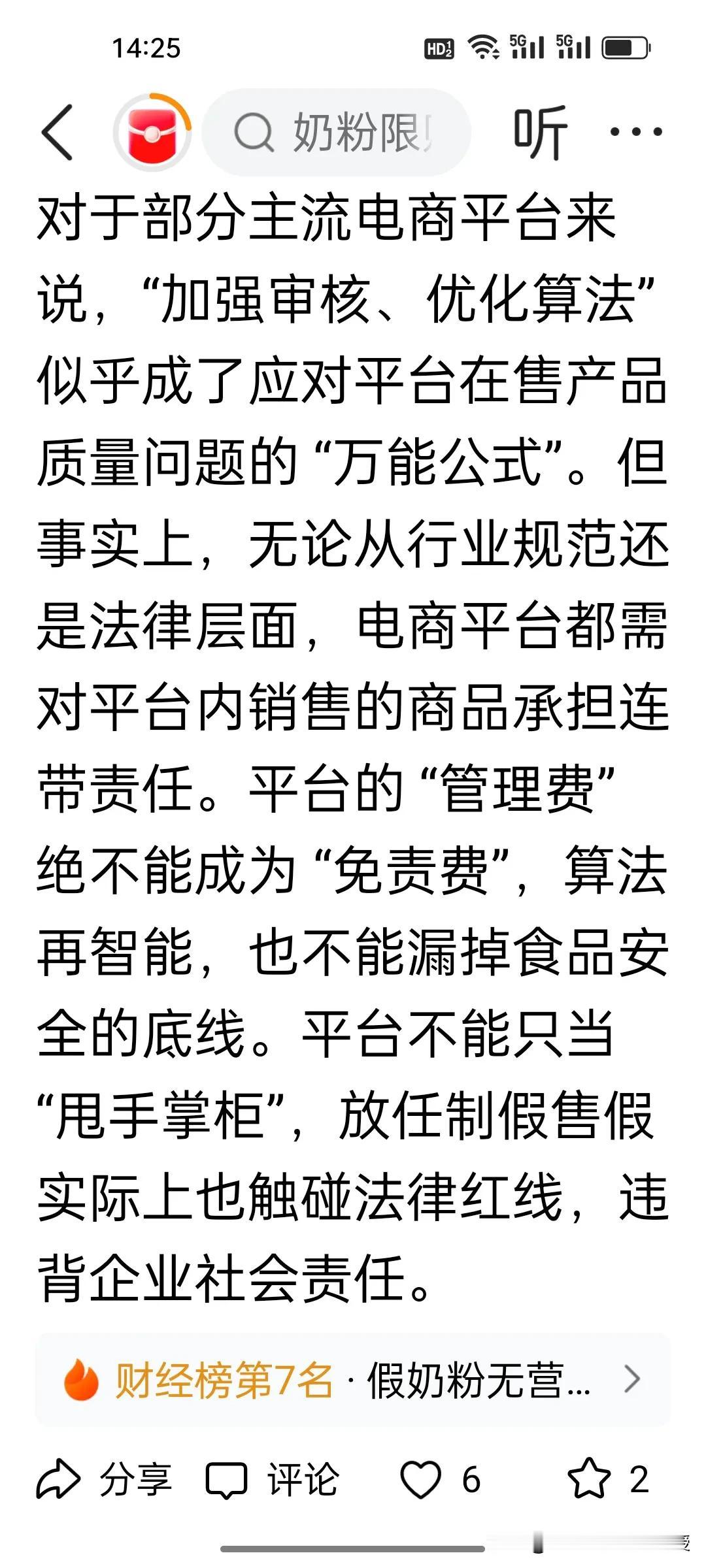 《文汇报》这篇关于假洋奶粉的评论一针见血啊!观点明确指出,电商平台也有责任。 原话是:平台的 “管理费” 绝不能成为 “免责费”,算法再智能,也不能漏掉食品安全的底线。 制造假货的河南某县作坊已经被警方一锅端,但是不排除还有其他地方依旧有制假单位。除了需要各地的市场监管部门明察秋毫,作为“看门人”的电商平台,必须要把控好产品质量,不能让假货泛滥,对于商家审核要从严,不能为了赚钱而没有法律底线,对于问题商家视而不见,对于有消费者给平台投诉反映的假俄罗斯奶粉等问题要一查到底,这个问题也不是一天两天,很多网友都表示在各大电商平台均买到过俄罗斯假奶粉,央视报道也说了河南这批假奶粉在电商平台全国销售。 各大电商平台确实要严把质量关,守住责任链,做到一查到底并公示结果,建立制假售假者终身禁入机制,这也是各电商平台行稳致远的必经之路。