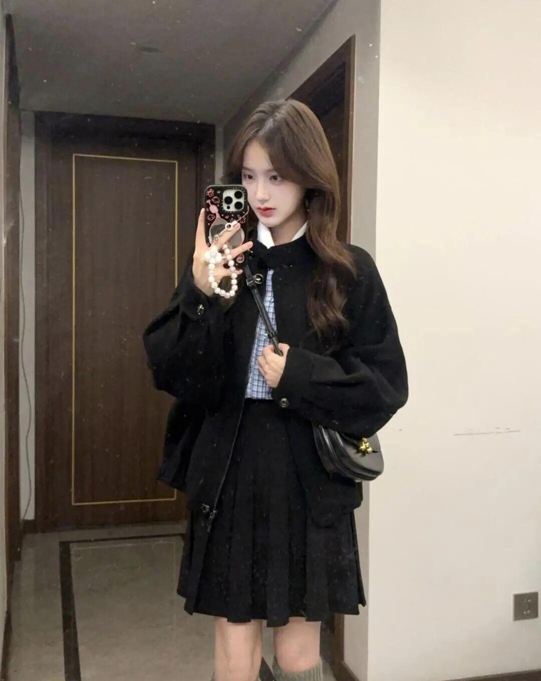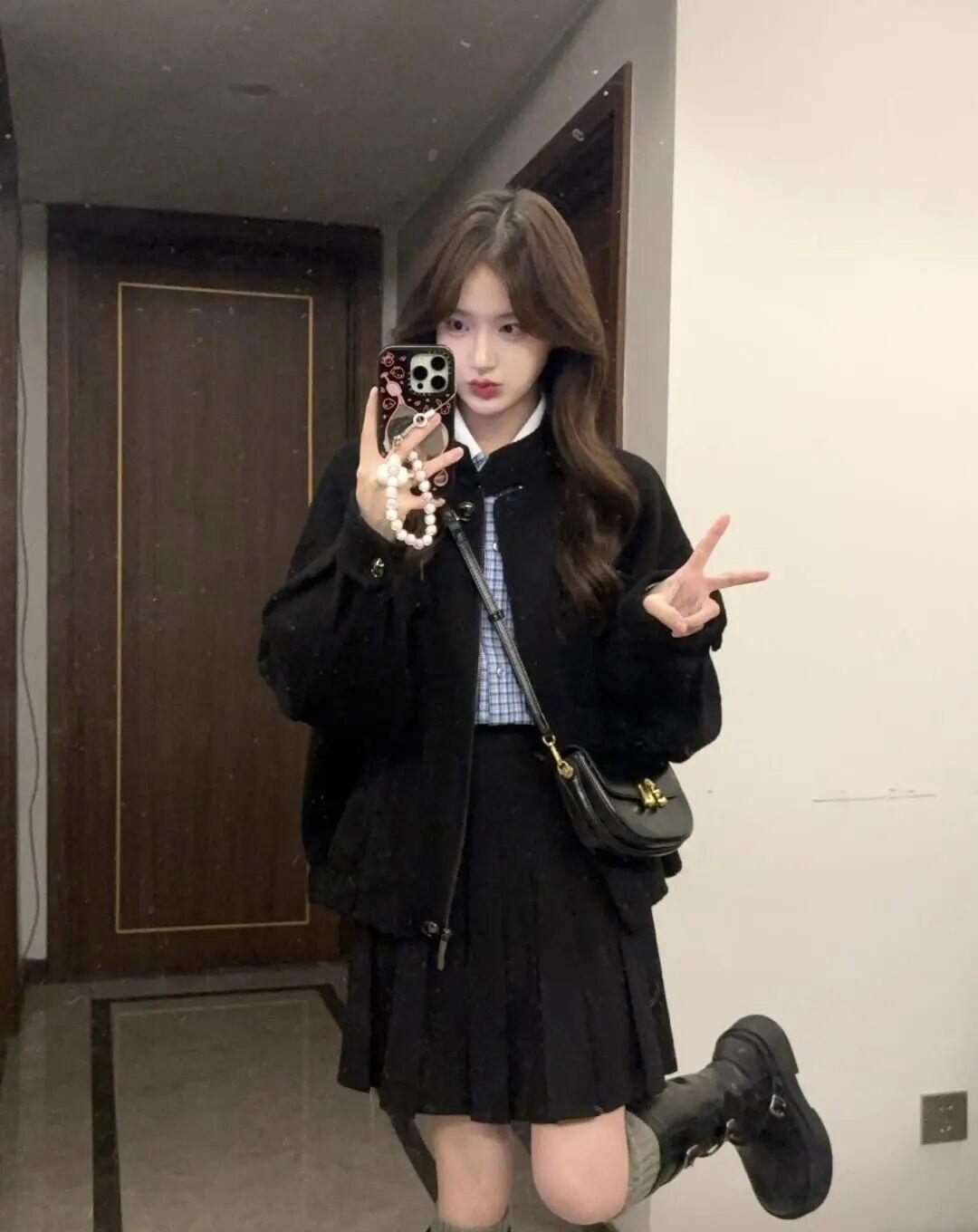 今天是黑系甜酷学姐✨ 珍珠链条手机壳+学院风套装,把慵懒和精致焊在身上