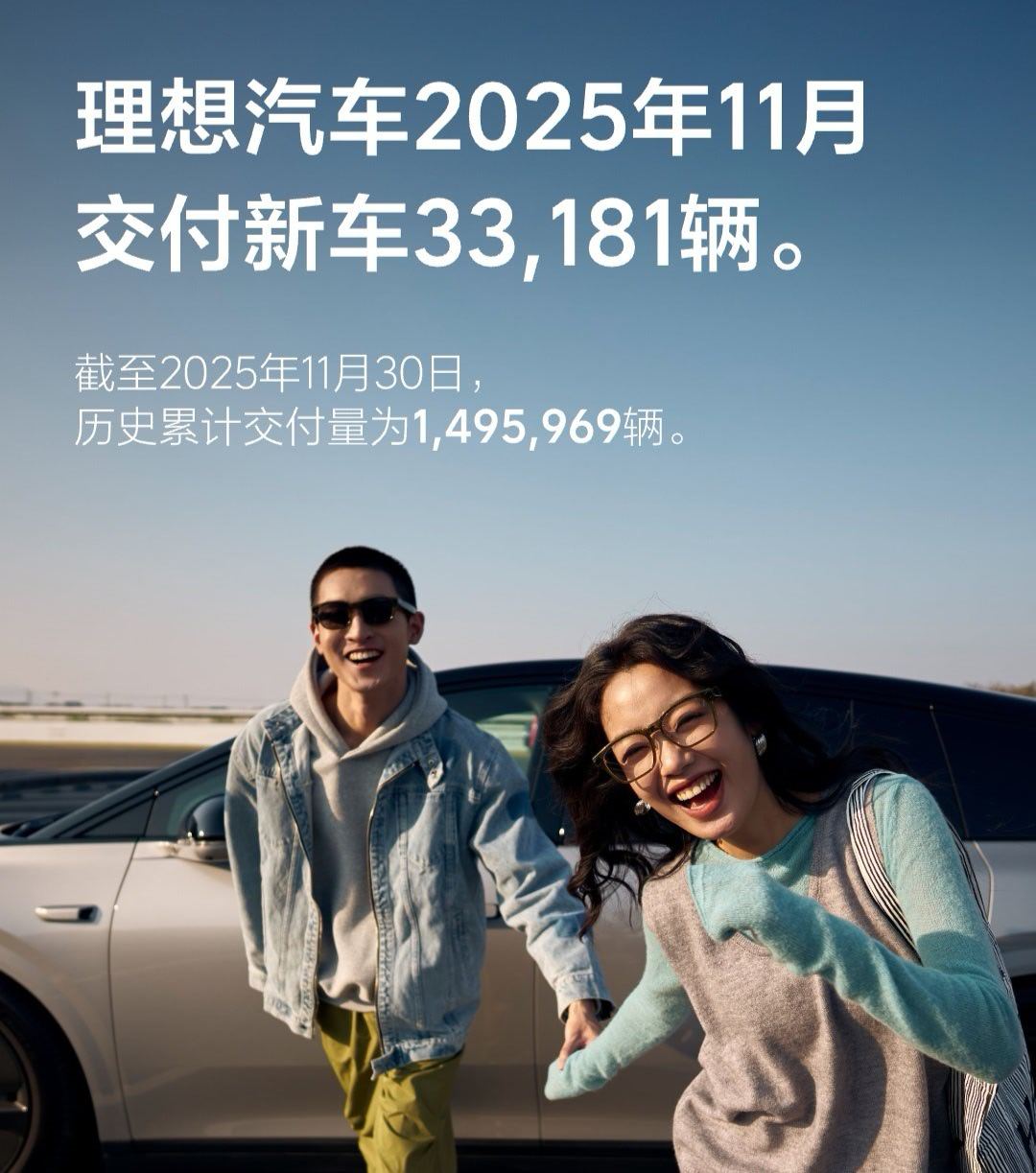 理想汽车11月交付33181辆,同比下滑31%。曾经的新势力一哥,靠着增程+“