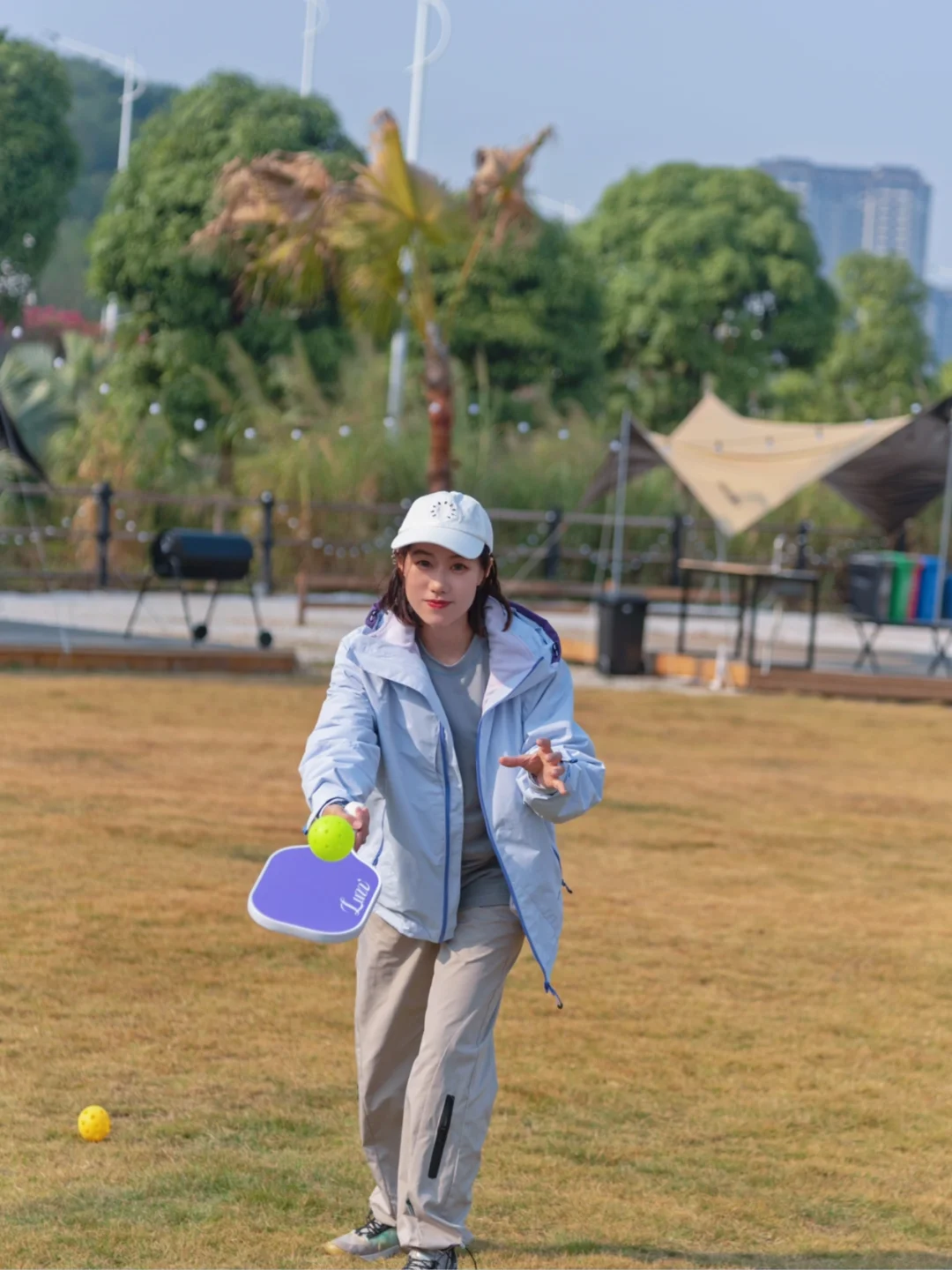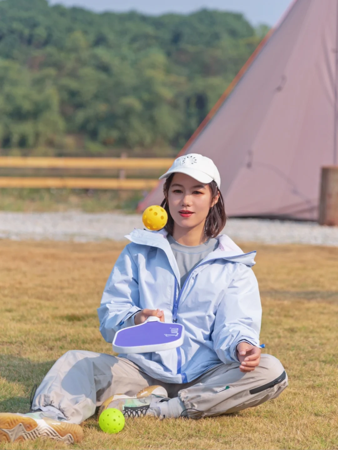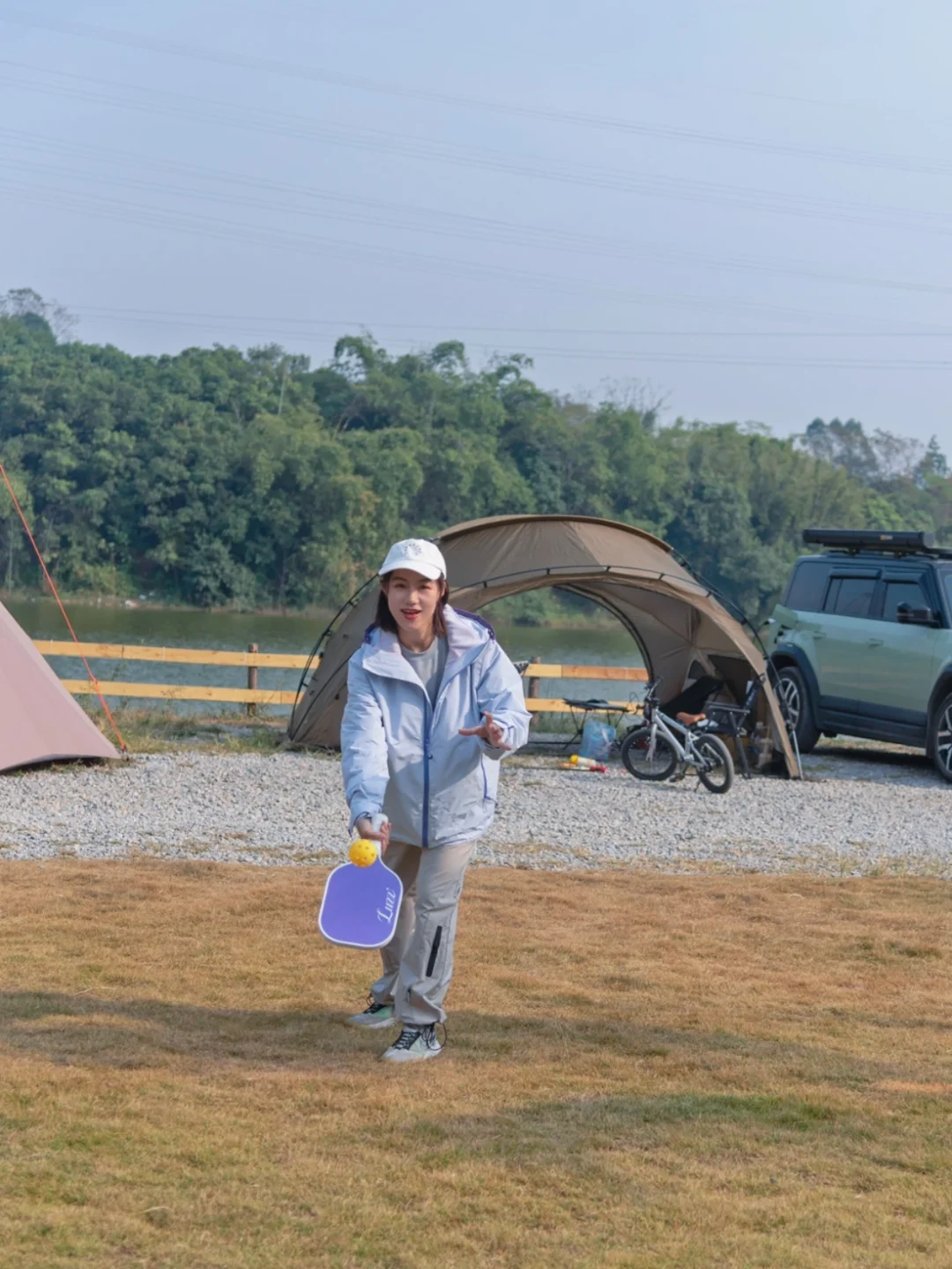 1️⃣蕞喜欢入口处的平台大草坪,在这里解锁了匹克球飞球截击新玩法,醉近痴迷匹克球无法自拔,在家里和露营都不忘带上练习,许愿能早日找到组织更上一个level