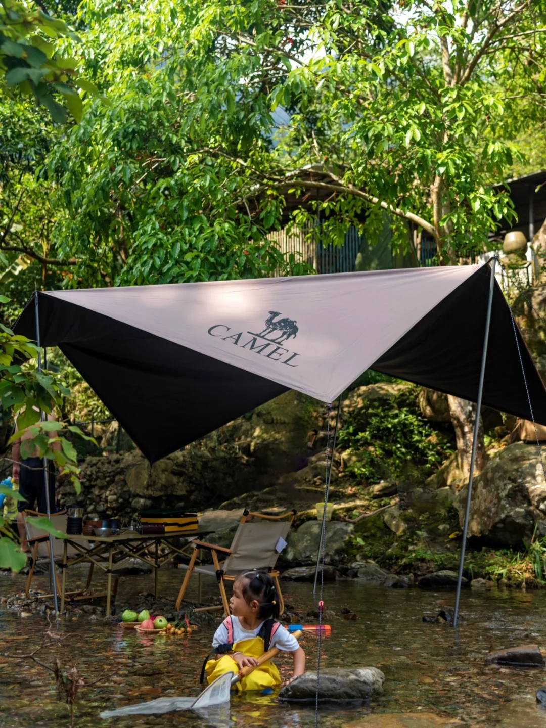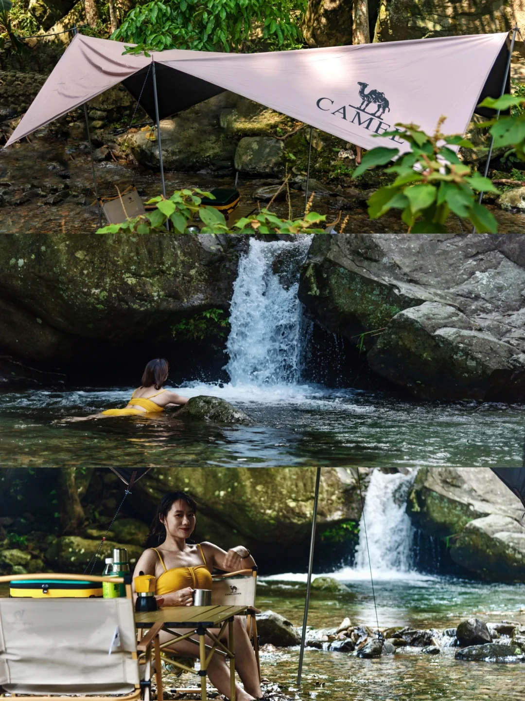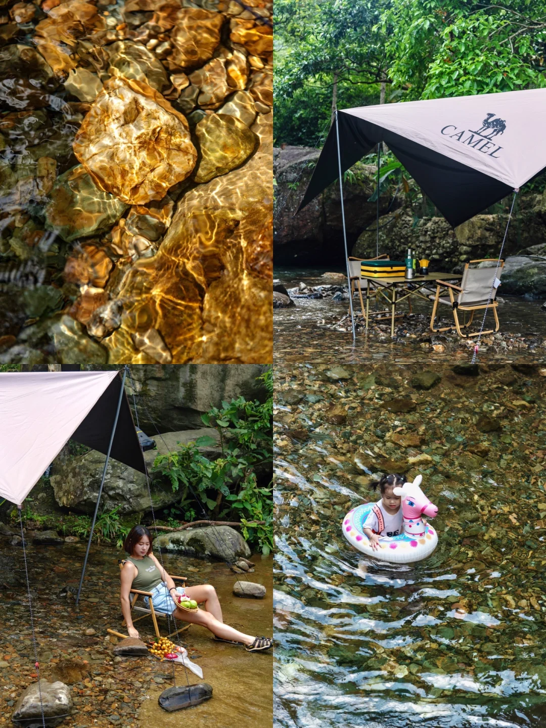 2️⃣仙女潭9~14点还是很晒的,黑胶天幕是不二之选。这里有2个位置可以水上搭,有浅滩区和深水区,大人小孩玩水都很合适