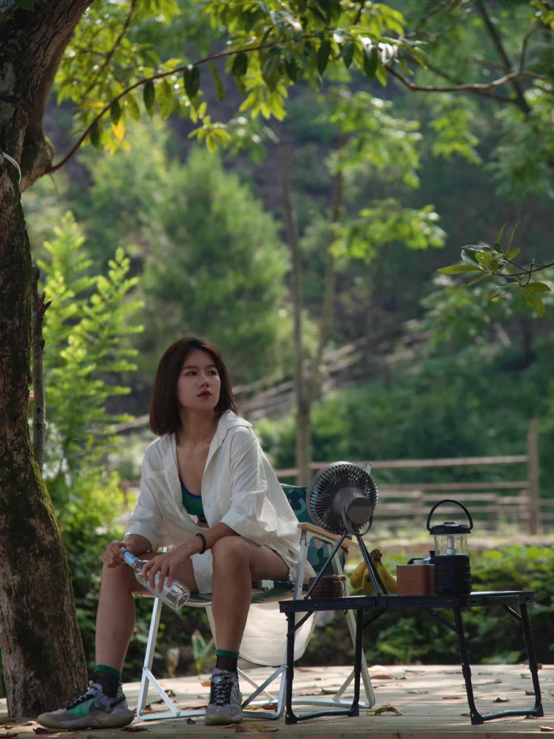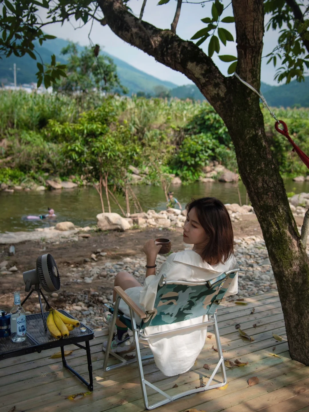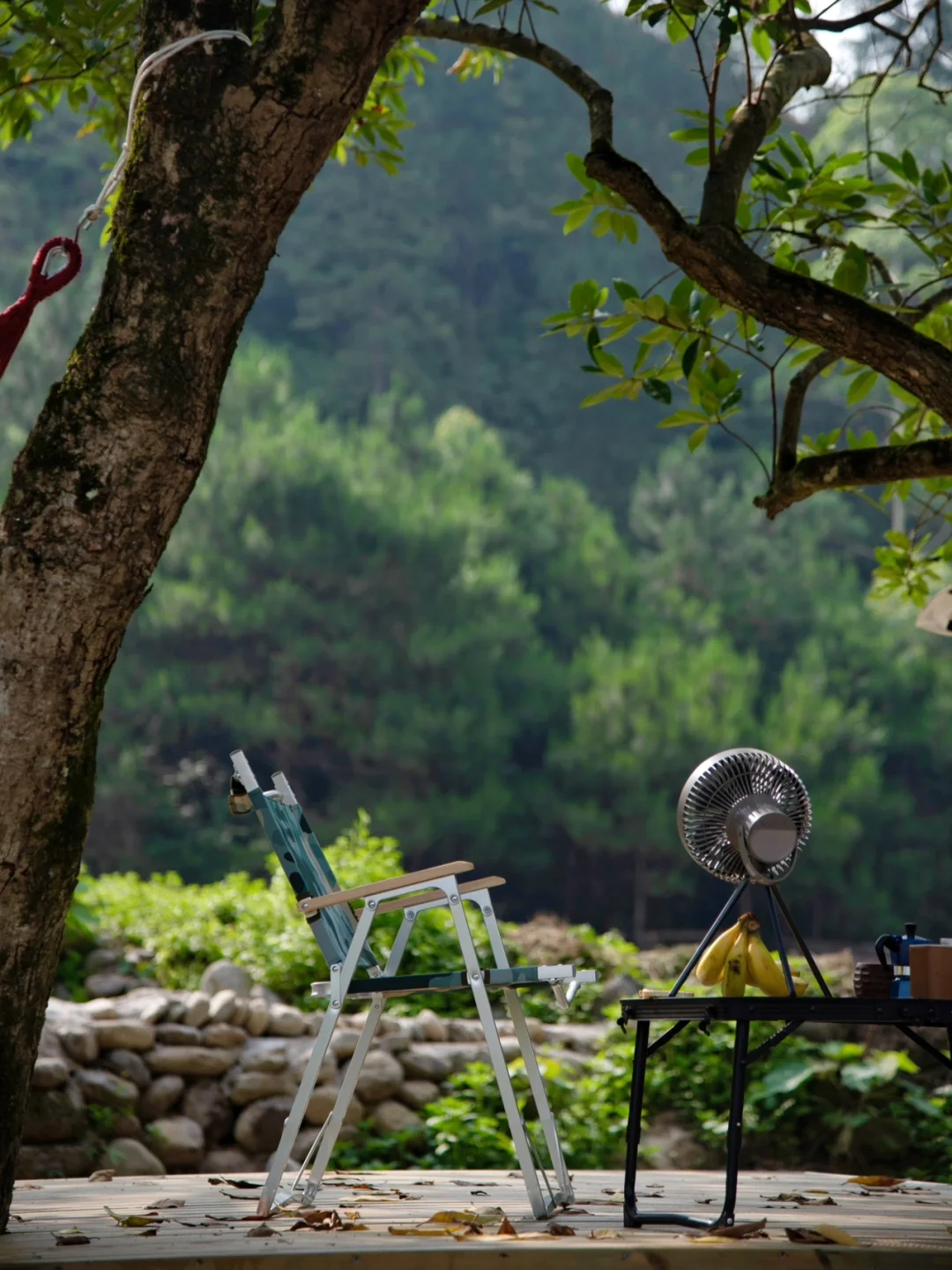 简单摆上一张Foxcamp露营椅子,一个桌子,吃个早餐,坐在平台上吹着风看看风景,溪水潺潺,相当舒适