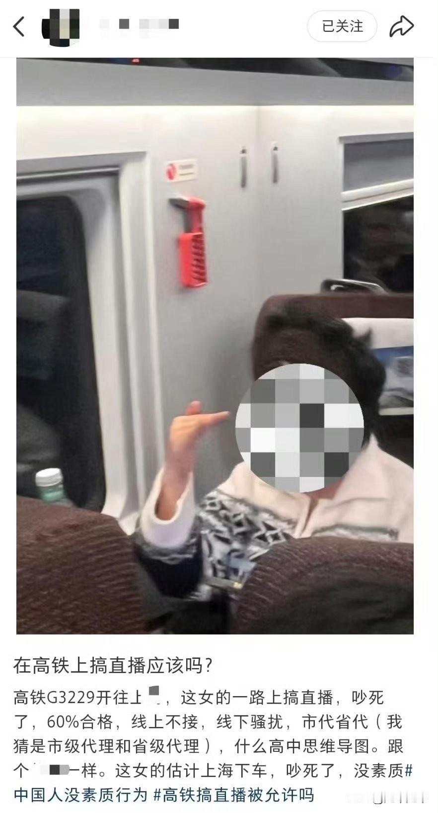 现在各行各业都这么“卷”啊😦 12月1号有网友发帖称,在乘坐G3229次列车时,被同车旅客一路高声直播所打扰,随后向12306投诉。(图二)随后12306的回复是铁路部门目前没有限制乘客在车上直播的规定,若被打扰可寻求工作人员帮助或直接与对方沟通。乘务员仅能劝导降低音量,无权强制终止直播或没收设备。 现在到处都是直播镜头,有时候正常走路,或者买个东西,突然发现自己走进了别人的直播镜头,这哪儿是分享生活,有些主播为了博流量,在商场、街头毫无顾忌地架着设备拍摄,完全不征询路人同意,镜头扫到谁算谁,路人不声不响就成了别人直播间里的“背景板”。 在这个事情中网友质疑铁路部门缺乏对公共安宁权的维护手段和法规。铁路需尽快出台分贝等量化标准,搭配噪音监测技术。毕竟连地铁里都不准许手机使用外放功能。这也需要直播承运平台主动监督,毕竟公共空间不是个人秀场。 化解矛盾不能仅靠乘客自救,平衡好个人与集体权益才是关键。 高铁低素质行为