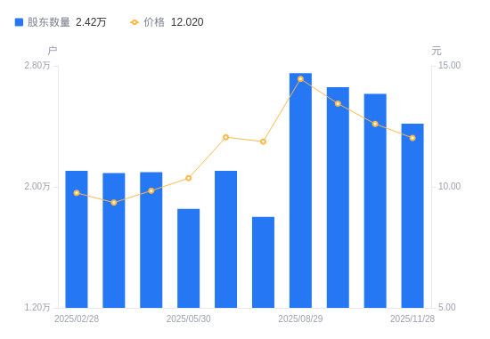 日期A股户数(户)流通A股户均持股数(股)户均持股市值(万元)2025-11-28241749700.7111.662025-10-31261428970.4311.302025-09-30265828821.9511.862025-08-29275188521.8712.322025-07-311800913021.5415.462025-06-302105411138.2613.422025-05-301854212643.7713.102025-04-302096611181.9511.002025-03-312090611214.0410.492025-02-282105211131.3810.85