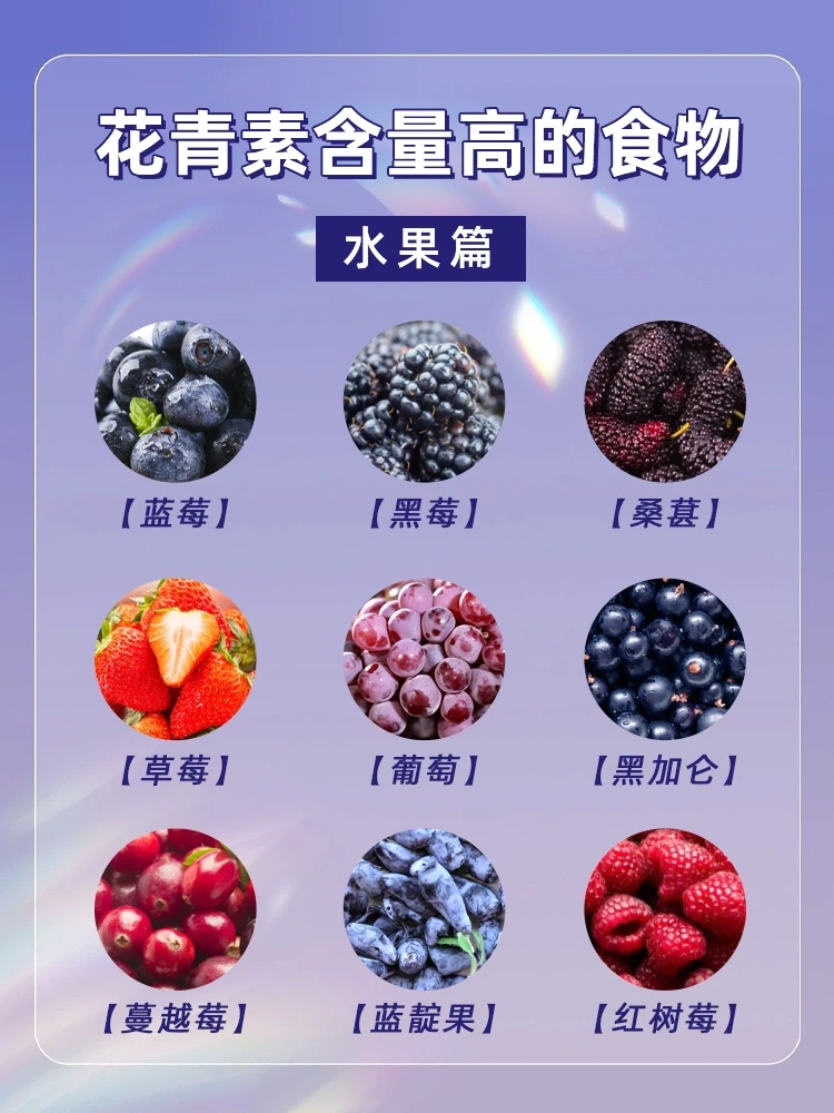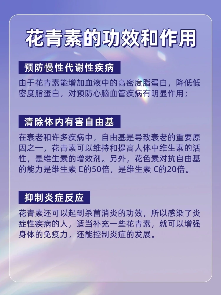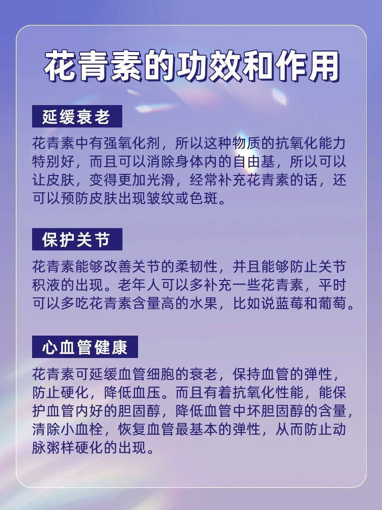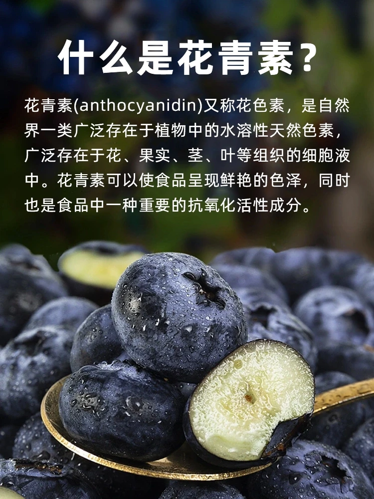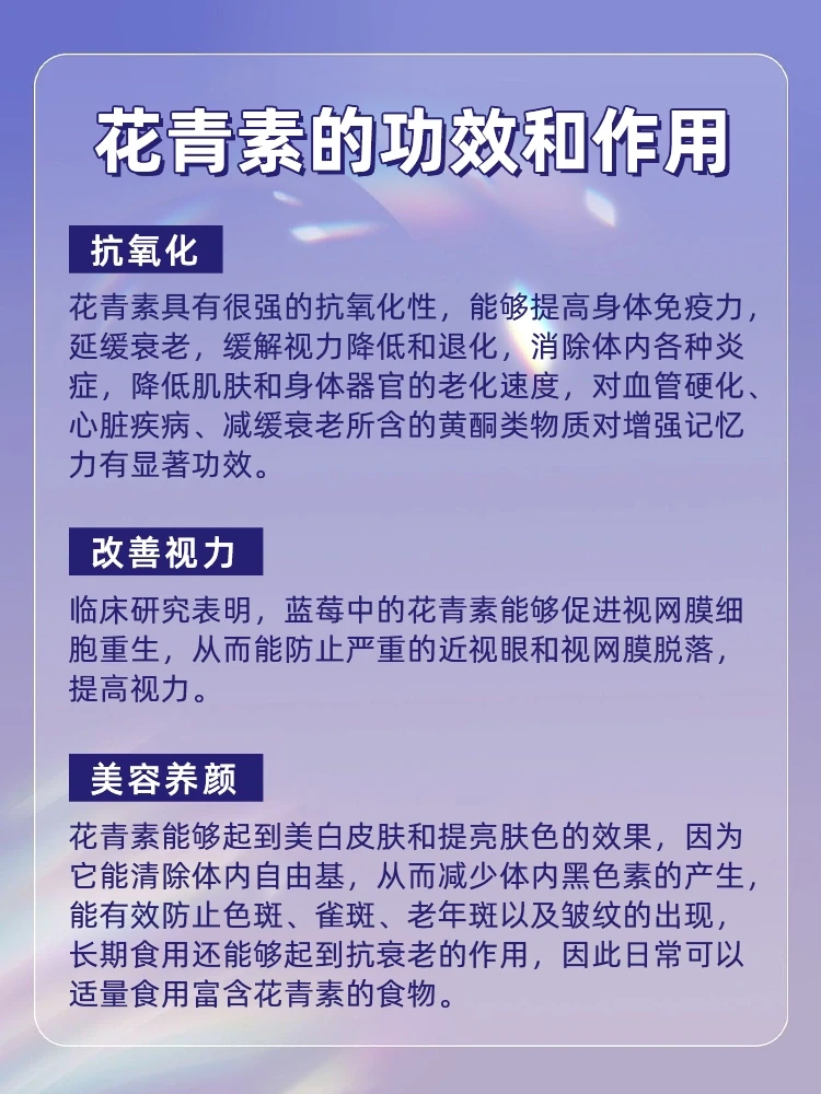 花青素具有很强的抗氧化行,能够提高身体免疫力,延缓衰老,缓解视力降低和退化,消除体内各种炎症,降低肌肤和身体器官的老化速度,对血管硬化、心脏疾病、减缓衰老所含的黄酮类物质对增强记忆力有显著功效。