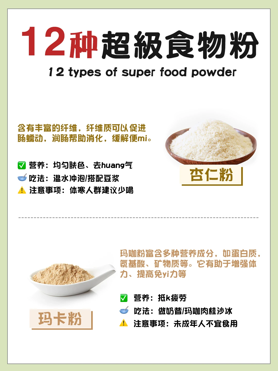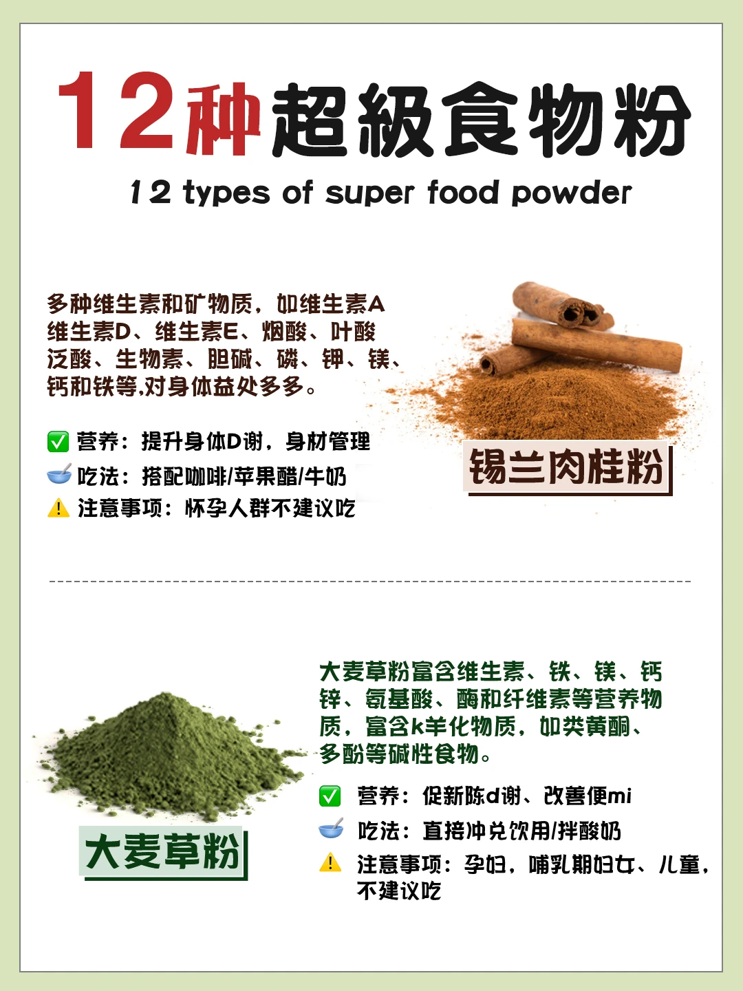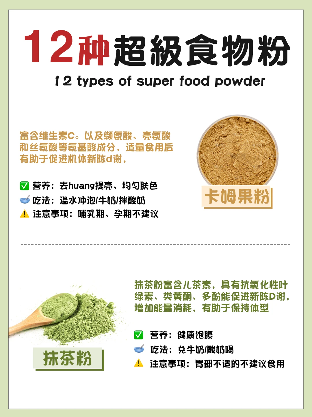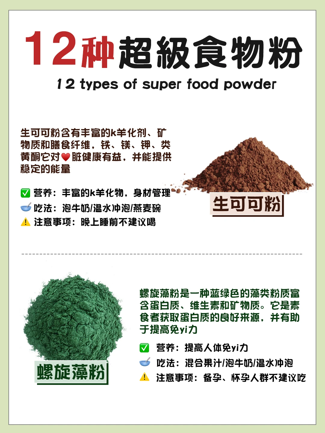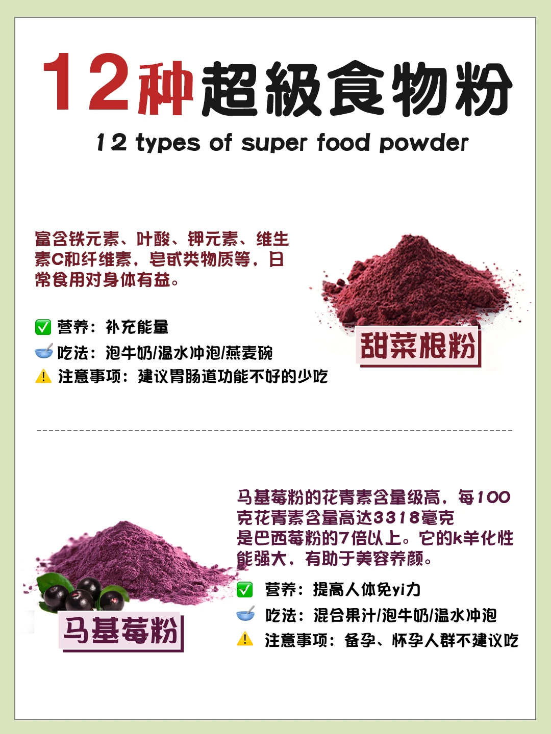[微笑R]今天分享12种超级食物粉 ☑️巴西莓粉 ☑️姜黄粉 ☑️生可可粉 ☑️螺旋藻粉 ☑️甜菜根粉 ☑️马基莓粉 ☑️锡兰肉桂粉 ☑️大麦草粉 ☑️卡姆果粉 ☑️抹茶粉 ☑️杏仁粉