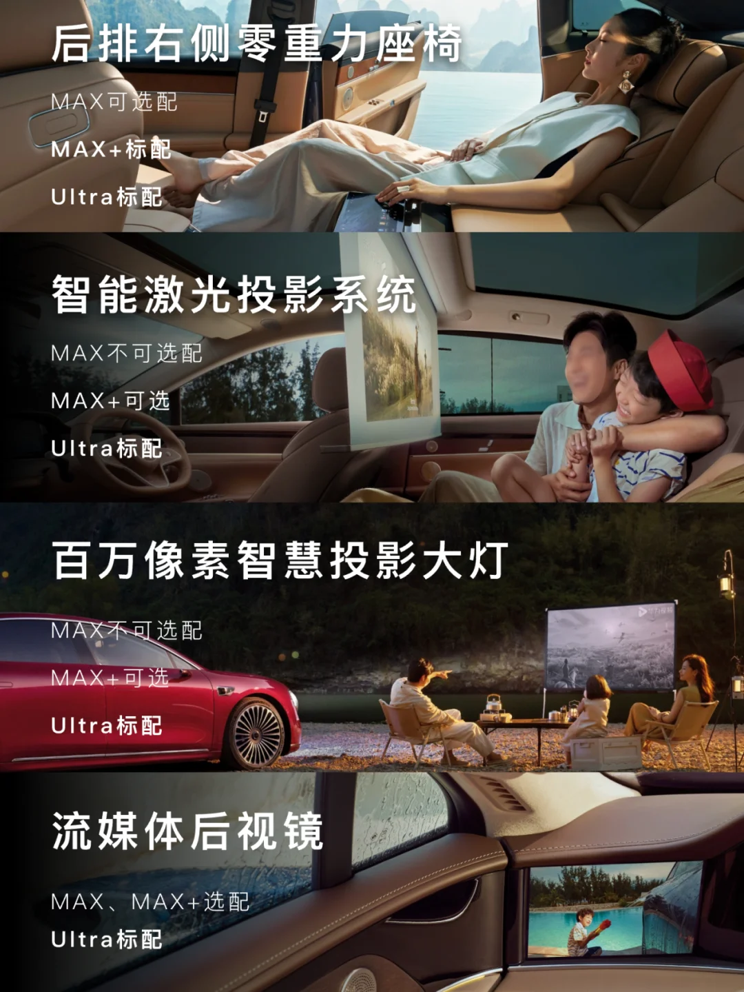 1️⃣Max 版:全系标配高阶智驾,但「百万像素投影大灯」和「电子外后视镜」为不可选装,仅Max➕可选配,Ultra 标配
