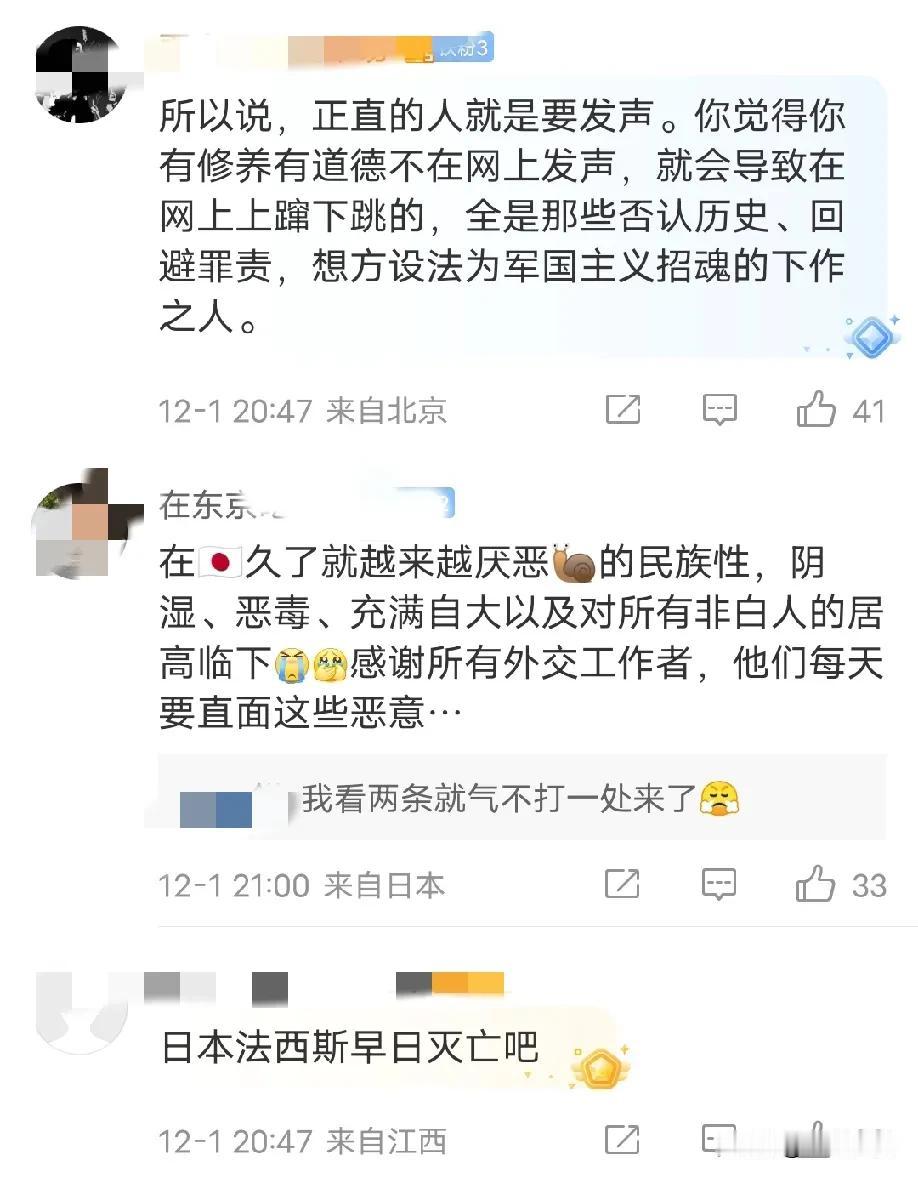 日本80%的人支持高市早苗,还有日本人对侵略历史的各种炫耀,特别是在我们大使馆的账号的评论区下,连在日本的华人网友都受不了,很多网友去看了日本人的留言,都受不了,而反过来我们国内却有一群日本明星的粉丝,因为日本明星的演出被暂停,各种阴阳怪气,甚至说我们不应该停掉日本明星的演出,这个反差真的令人唏嘘!