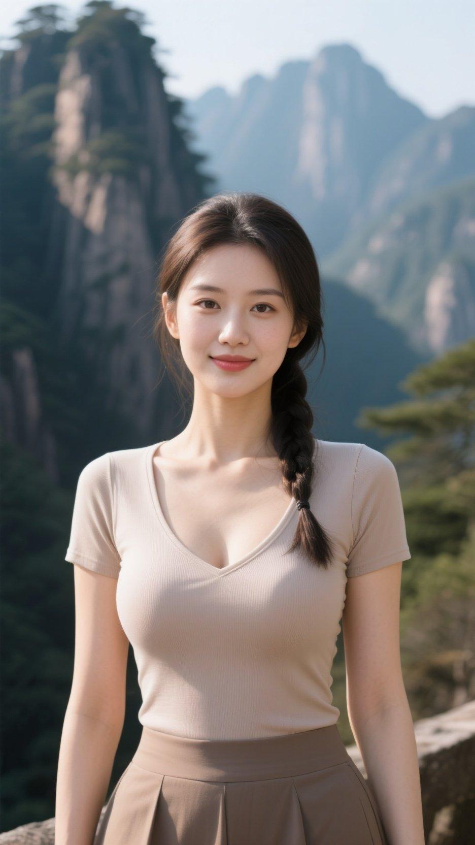 姑娘站在山前,风景美如画。