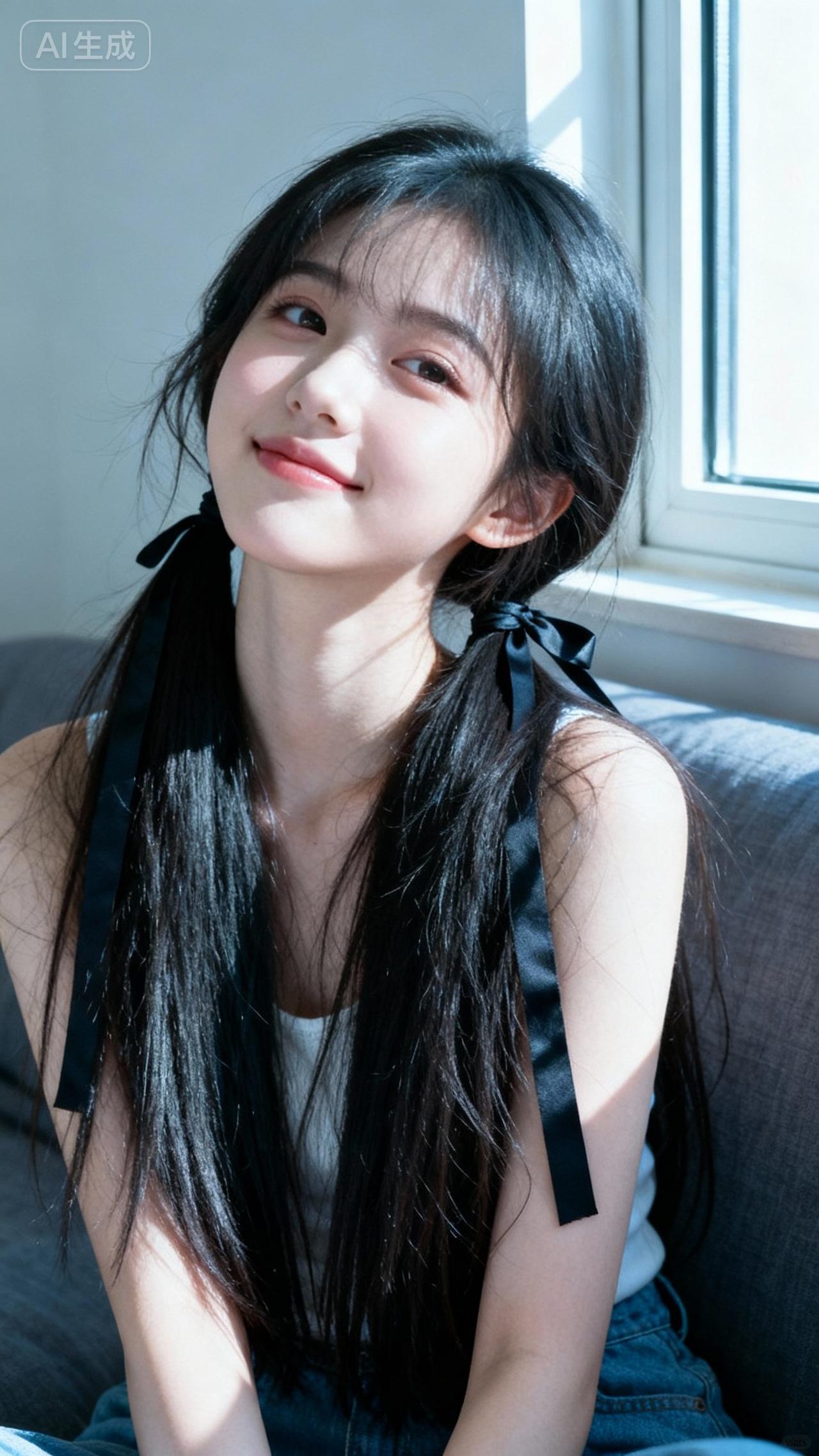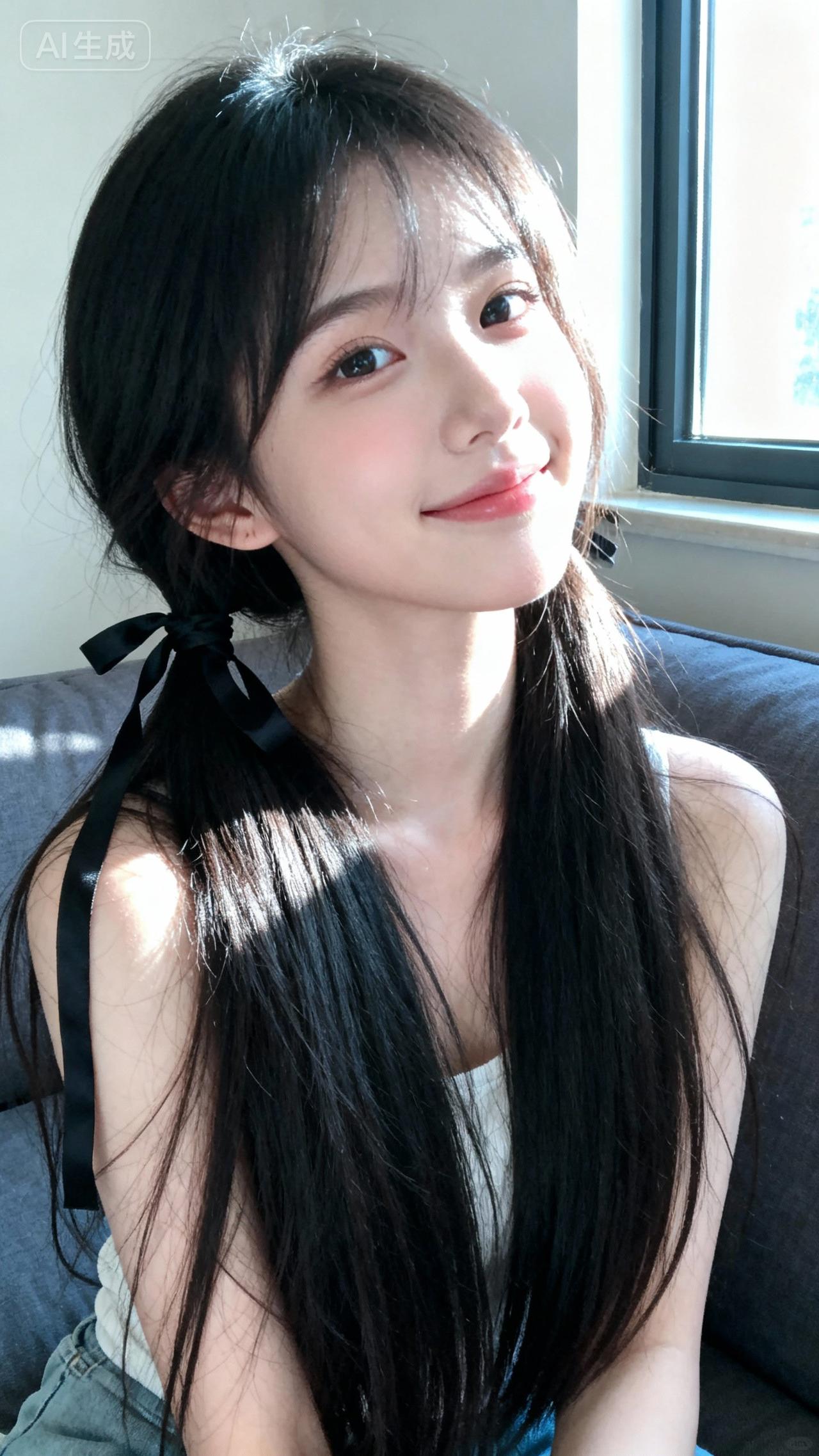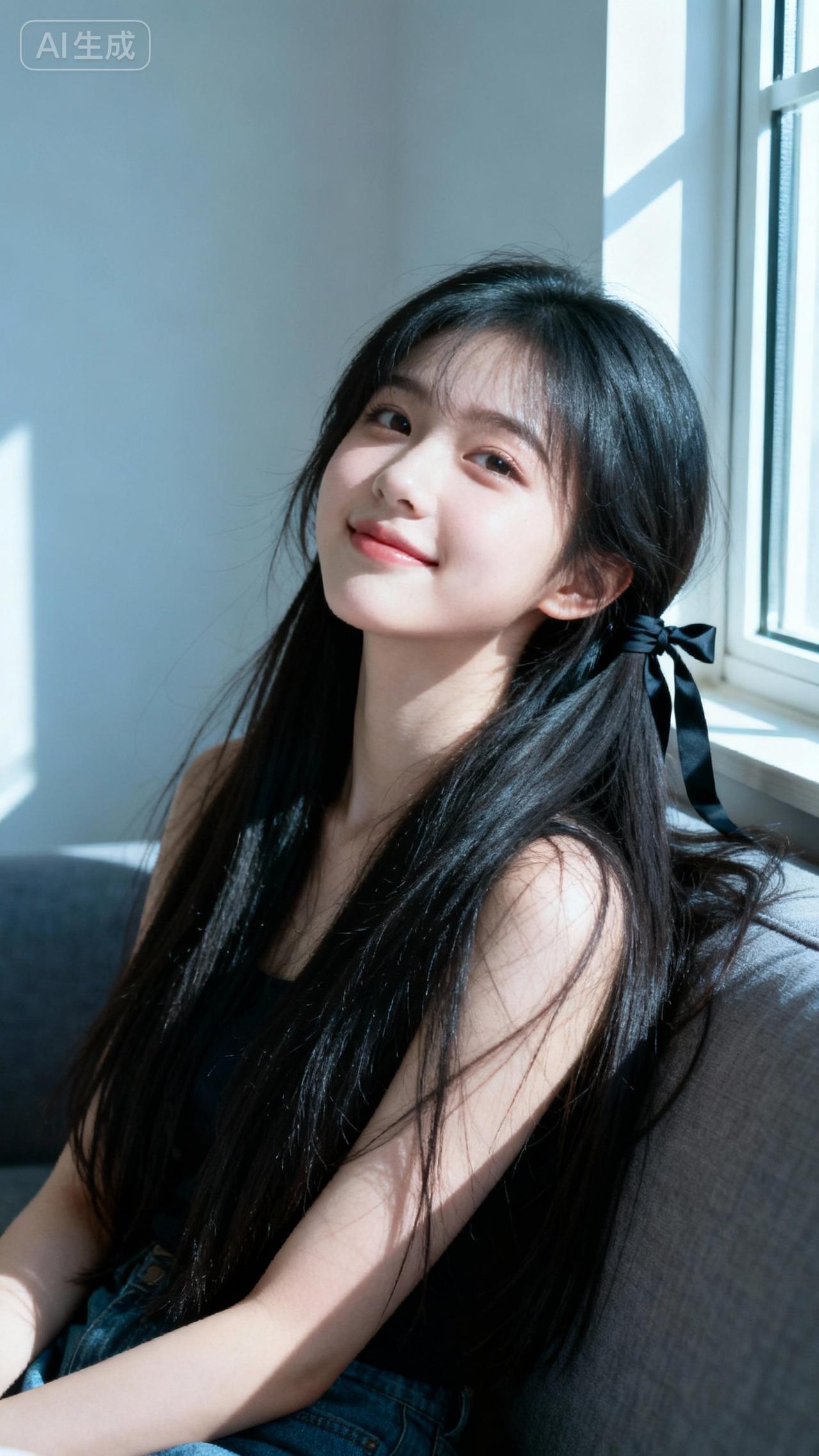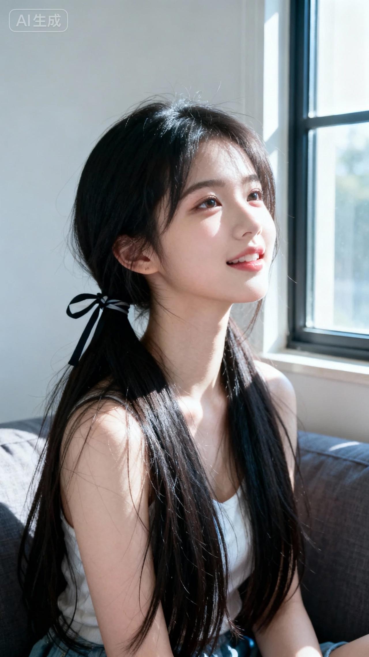 阳光洒在她微笑的脸庞上。