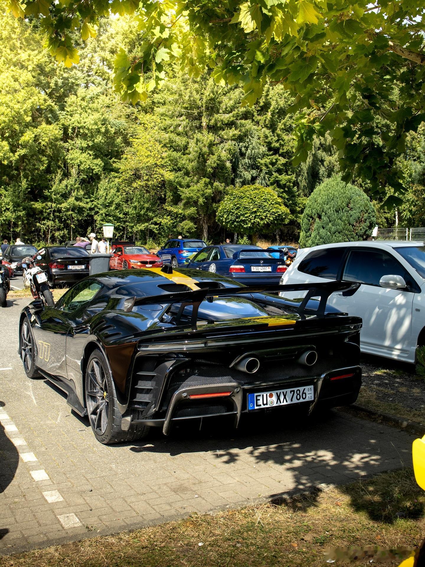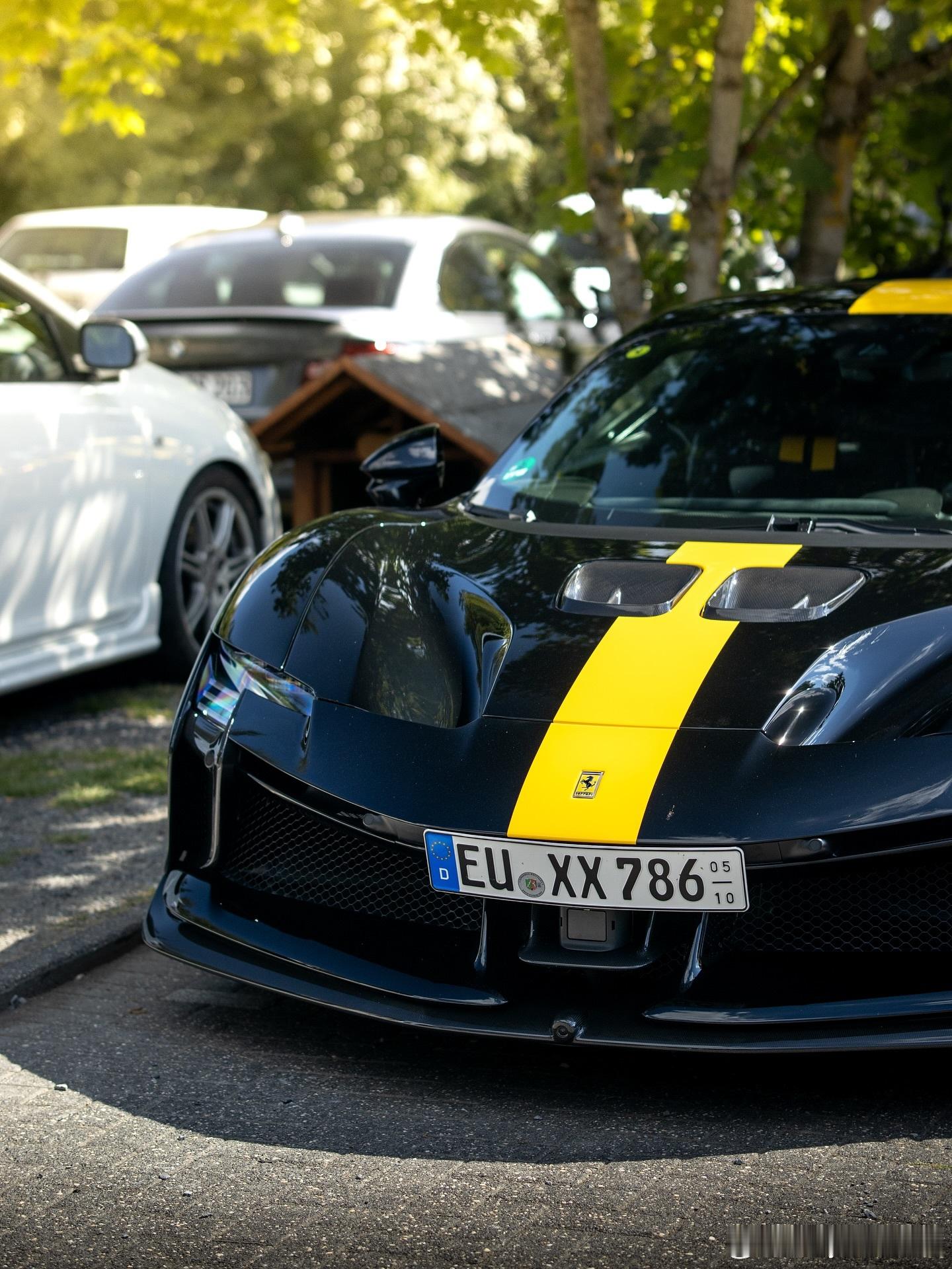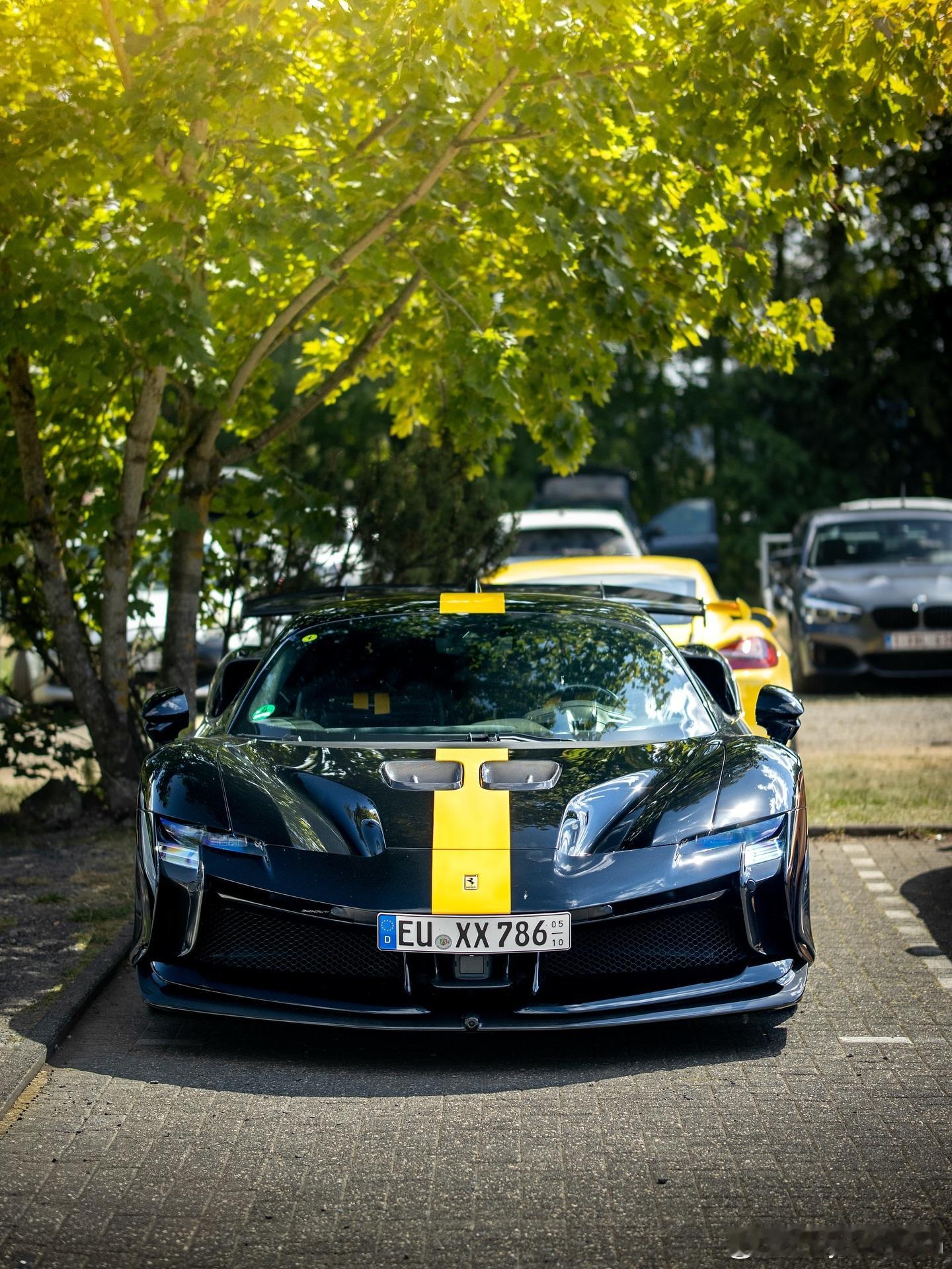 外观配色为Nero DS,搭配Giallo Modena长赛车拉花,外观方面还选择了碳纤维轮毂,此外,两侧车门下方添加了以车身颜色为主体,Giallo Modena为描边的77号赛车编号。内饰方面为Nero Alcantara,搭配黄色的四点式赛车安全带,座椅头枕上绣有黄色的马标。交付于位于德国科隆的Maranello Motors GmbH。图片来自.carmedia
