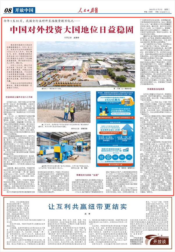 分析人士认为,高水平对外开放是“走出去”和“引进来”并重的开放,中国企业对外投资高质量发展,不仅有利于全球要素优化配置,也有利于相关国家和地区经济社会发展及民生改善,更好实现互利共赢。