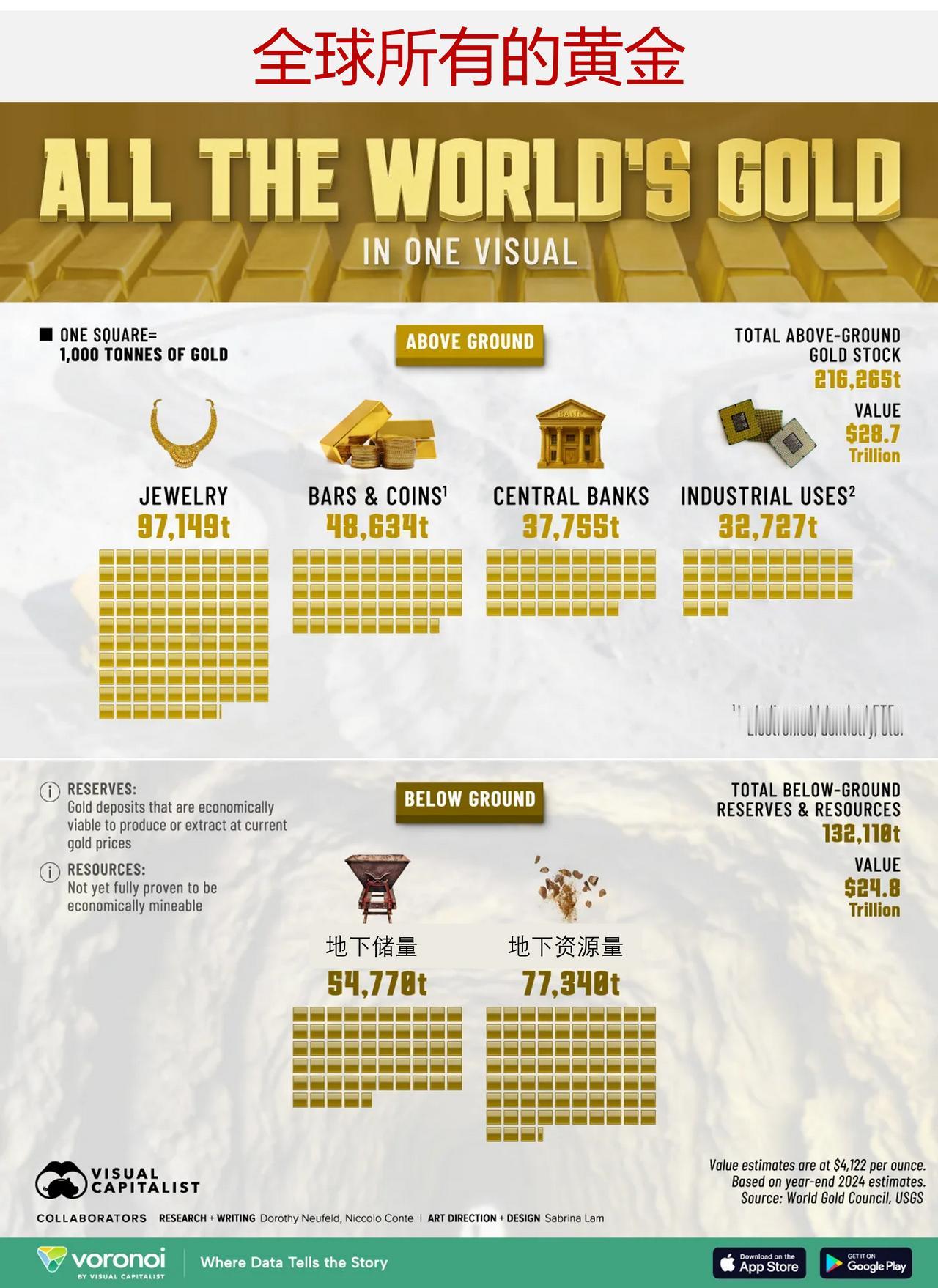 全球一共有多少黄金? 目前,黄金价格较 1980 年经通胀调整后的历史最高价高出约 40%。 尽管自 10 月 20 日的 4380 美元高点以来已下跌 54%,但黄金价格仍处于历史高位,因为投资者将黄金视为一种可靠的保值手段。全球的地上黄金存量若全部堆叠起来,高度约为 22.3 米(73 英尺),可形成一个立方体。 这张图表展示了截至 2024 年年末的全球黄金供应量,包括地上黄金存量以及地下黄金储量与资源量,数据来源于世界黄金协会。 珠宝是地上黄金的最大类别,总量达 97149 吨。 去年,印度是全球黄金首饰的最大买家,共购入 560 吨。中国位居第二,购入量为 510 吨。在这些地区,黄金与诸如婚礼和文化传统等重大生活事件紧密相连。 金条、硬币以及以黄金为支撑的交易所交易基金共持有 48,634 吨黄金,这一数量远远超过了各国央行的黄金储备量(37755 吨)。截至 2024 年年底,美国、德国和意大利在其央行储备中所持有的黄金总量居全球之首。 与此同时,工业用途(如电子和牙科领域)的用量为 32,727 吨。例如,许多半导体芯片会使用黄金来对导线进行涂层或粘接处理,因为黄金具有良好的导电性。