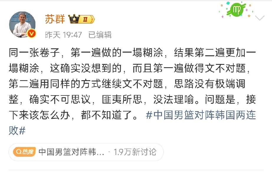 篮球名嘴苏群:男篮同一张卷子,第二遍更加一塌糊涂!王猛直言不讳:男篮输韩国是历史级别惨案 ;胡明轩的问题之前我就说过,他控运节奏不协调,不像是一个控卫,他的突破基本上没变化,埋着头往里面冲,男篮打成这样和全运会本身没关系,突然想起一句话,无辽不成军,可是当下这一届中国男篮没有辽宁队球员,只有三个辽宁籍球员,唯一入选王岚嵚被dnp
