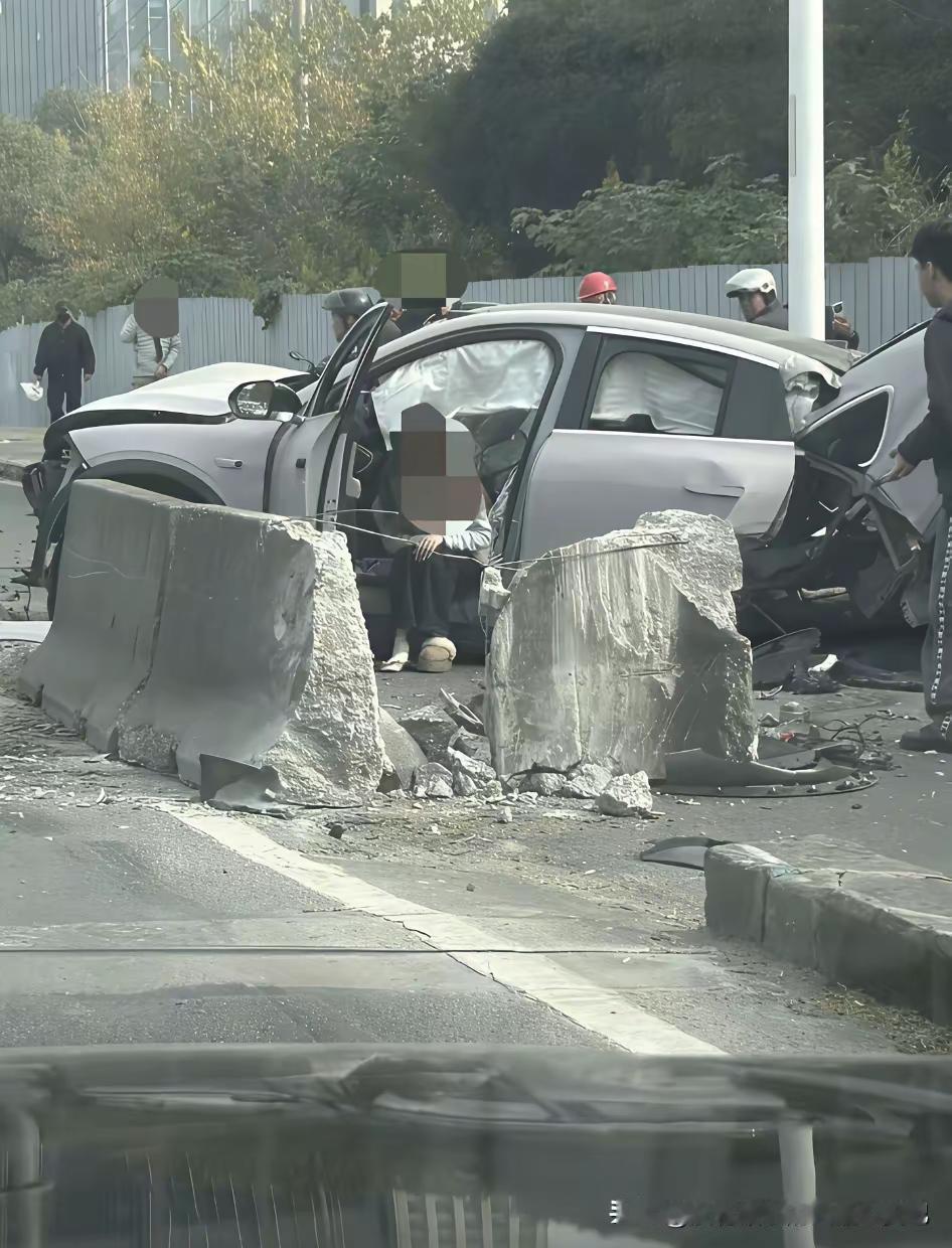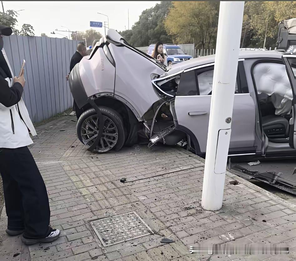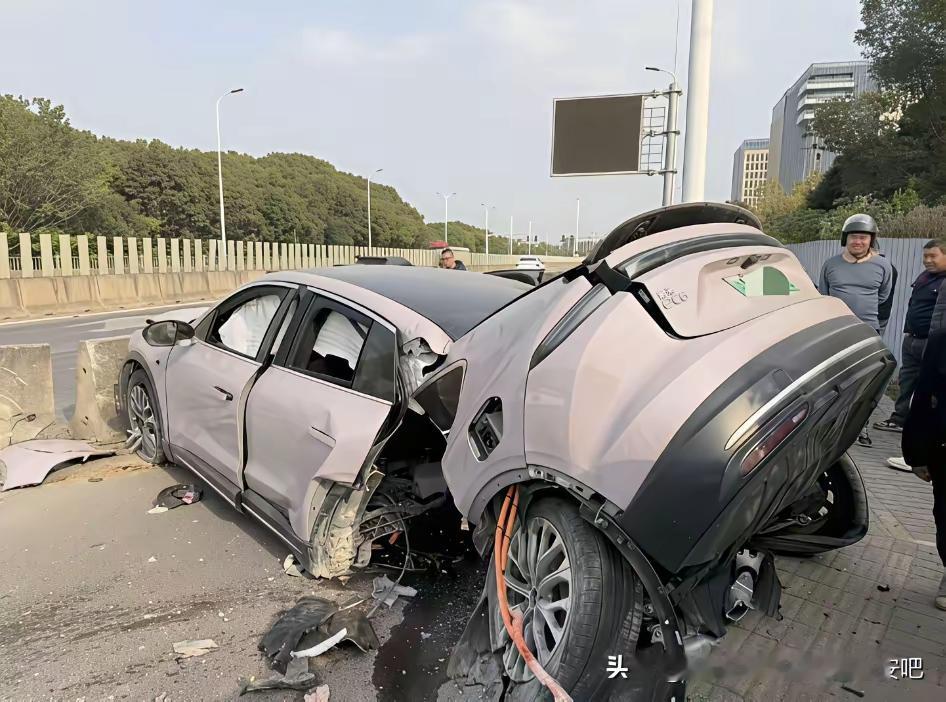 今天12月1号上海一辆新能源汽车撞到道路隔离柱子上了,车当时就断成了两截,驾驶员