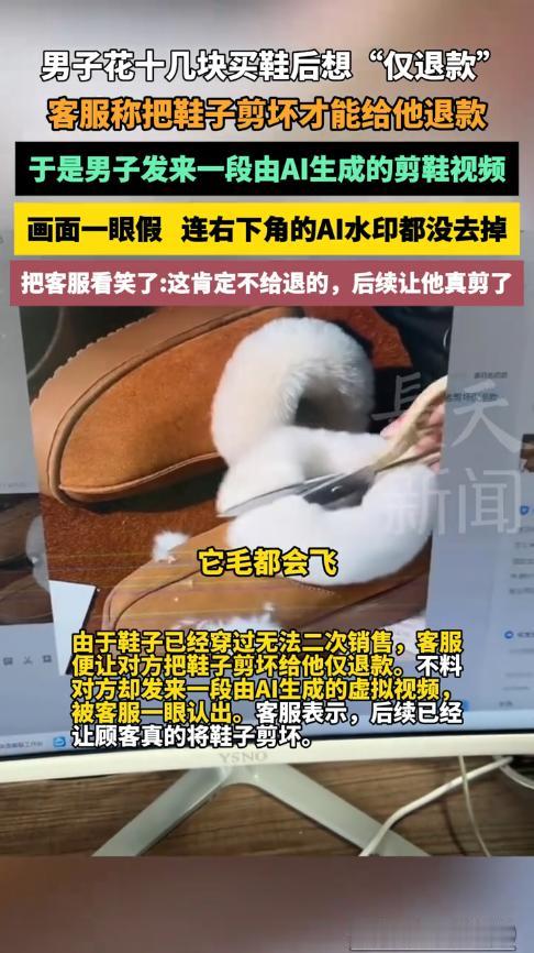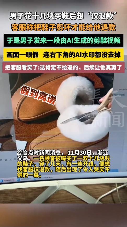 “聪明过头了!”11月30日,浙江义乌,一男子网购了一双棉鞋,可是穿了几天后鞋有些开线,于是他联系客服,想要“仅退款”,客服表示需要把鞋子剪坏才行,几分钟后,客服收到了男子发来的视频,可是却假的离谱!网友:AI真好用。 这几年,人工智能发展得异常迅速,可以说生活中各方面都能看到它的影子,虽然AI给生活带来了便利,但如果用在错误的地方,也会带来一定的影响。 随着天气越来越冷,不少人已经穿上了棉鞋,就在前几天,一名男子花了十来块钱,网购了一双棉鞋,可是他才穿了几天,鞋子就开线了。 男子觉得这是质量问题,因此找到商家想要退款,由于鞋子已经被穿了过好几天,即使寄回去也无法二次销售了,所以客服就要求男子把鞋剪坏。 几分钟后,男子发来一段视频,里面的内容虽然是剪鞋子,但是画面太假了,一看就是AI制作的,更令客服哭笑不得的是,视频的右下角还有水印! 男子见糊弄不过去,最后只能把鞋子真的剪坏了。 网友看后表示,真是个大聪明,这不是典型的想要白嫖吗,人家客服又不傻,好歹也要把水印去一下啊。 信息来源:《离谱!男子花十几块买鞋后想“仅退款”被告知得先把鞋子剪坏,于是他发来一段由AI生成的剪鞋视频,把客服都给看笑了.....》今视频长天新闻
