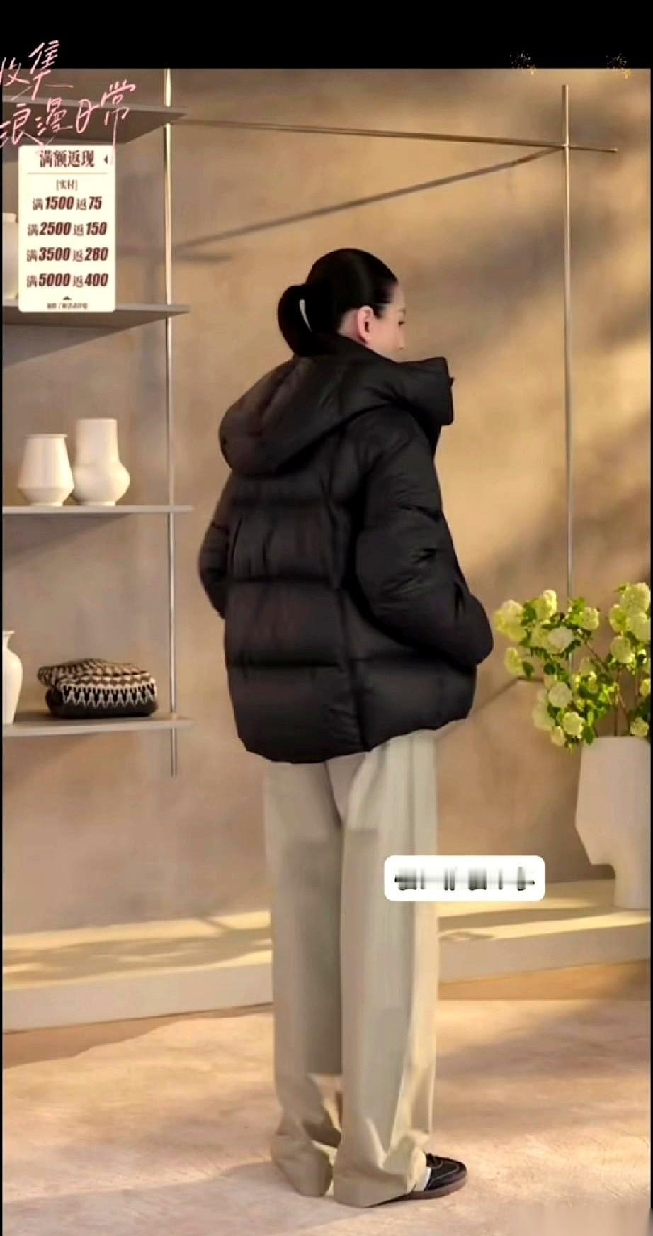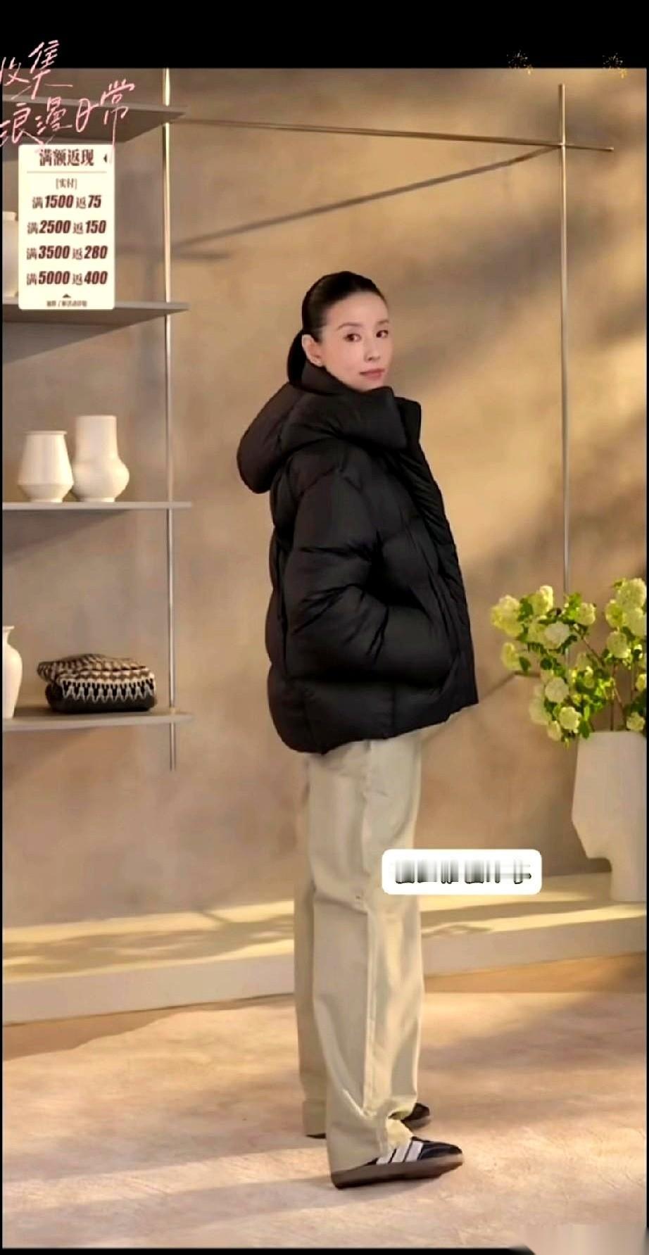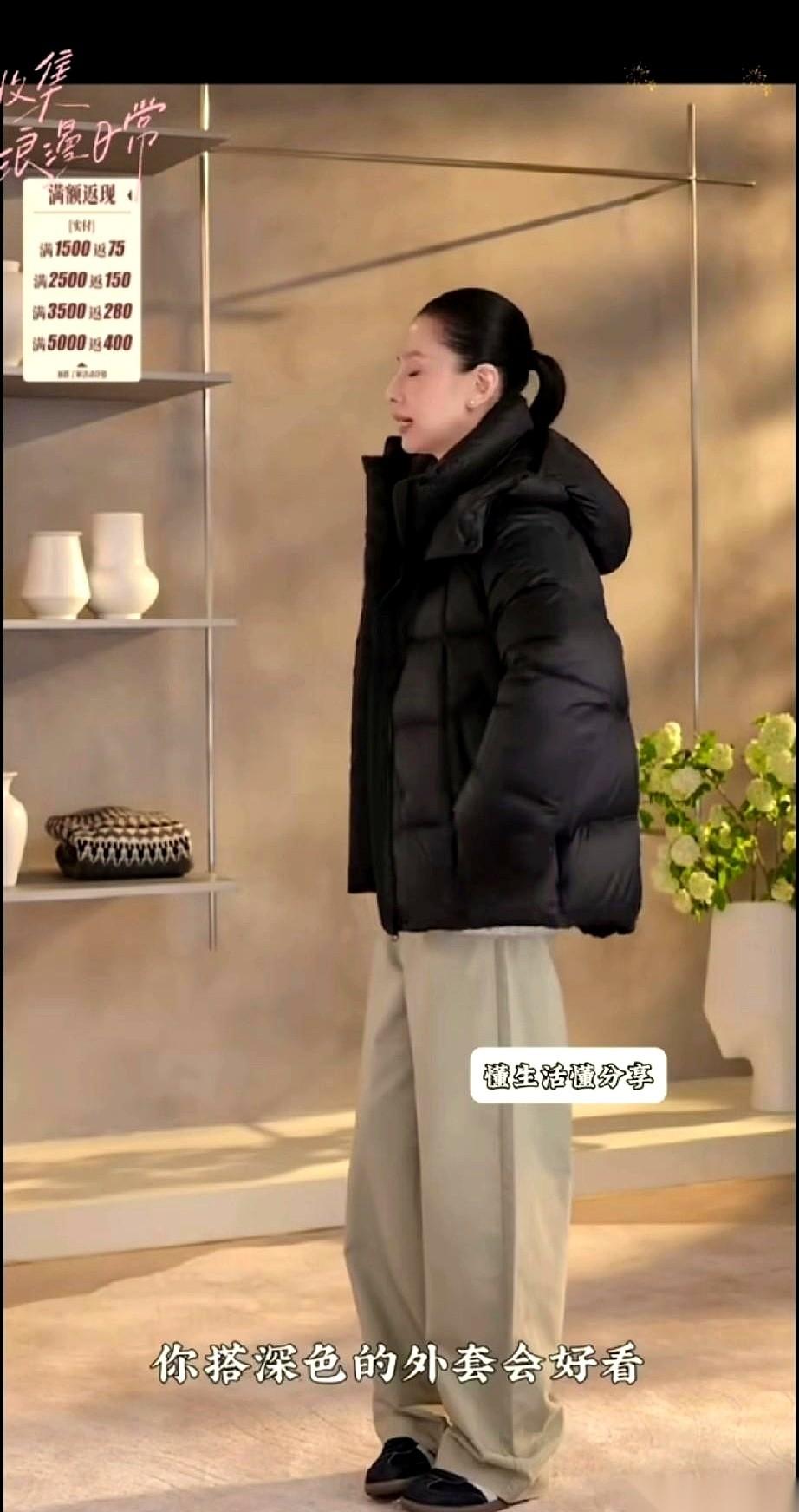 刷到董洁直播间,我突然什么都不想买了。 就一件普普通通的黑色羽绒服,一条白色阔腿