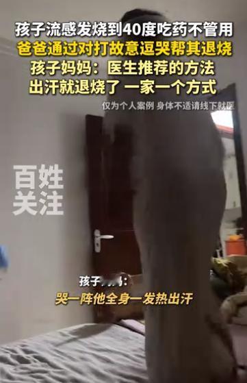 太有头脑了!河北一孩子发烧到40度,吃药不管用,不料,爸爸竟然故意惹孩子生气,然后假装和儿子对打,孩子打不赢,委屈得不行,被打得崩溃大哭!没想到看到孩子哭了,爸爸却笑了,妈妈也不帮忙,妈妈透露:这是医生推荐的方法,出汗就退烧了 ,一家一个方式! “哭了就好了,这就能开始出汗了!”爸爸看着自己的儿子哭泣,竟然笑了。 事情的起因是孩子发烧,体温已经飙升到40度,无论是吃药还是物理降温,都没有起到明显效果。为了让孩子“退烧”,爸爸使出了一个有些极限的招数:故意惹孩子生气,假装和他对打,让孩子因为气愤和不甘心而哭泣。 在很多父母看来,这种方式听起来似乎有些不可思议,但在医学上,情绪波动和流汗确实能帮助退烧。人体在极度激烈的情绪反应下,可能会导致交感神经兴奋,使得汗腺分泌更加旺盛,从而帮助体温散热。 所以当爸爸看到孩子哭了,他的心情变得放松了些,甚至露出了笑容。这笑容并非因为孩子受伤,而是因为爸爸确信,孩子可以开始通过流汗来降温。 不过在许多人眼中,爸爸的做法似乎有些极端。毕竟,打孩子是一种不太好的行为,不论是为了什么目的。可是,如果从医生推荐的方法来看,爸爸的行为似乎并不完全是为了“打”孩子,而是为了让孩子通过大哭和情绪波动来加速退烧。 然而,值得思考的是,这种方法是否真的适合所有家庭? 对于一些较为敏感的孩子,过度刺激可能会带来心理上的负担,甚至可能影响亲子关系。毕竟,情感上的创伤可能比生理上的问题更难以治愈。因此,家长在实施这种方法时,应该更多考虑到孩子的感受,以及这种行为可能带来的长期影响。 通过这件事,我们看到了家庭教育中对于孩子健康的一种另类探索,也看到了父母的焦虑和试图用不同方式帮助孩子渡过难关的心态。 但尽管如此,家长们仍然需要认识到,儿童的健康管理不仅仅是依赖某些“偏方”,而更多的应当是从科学的角度出发,选择安全、有效的方法来照顾孩子的身体和情绪。 信息来源: 贵州2频道百姓关注丨孩子流感发烧到40度吃药也不管用,硬核父母通过“对打”故意逗哭帮其退烧,孩子妈妈:医生推荐的方法,出汗就退烧了,一家一个方式 文丨小王 编辑丨史叔