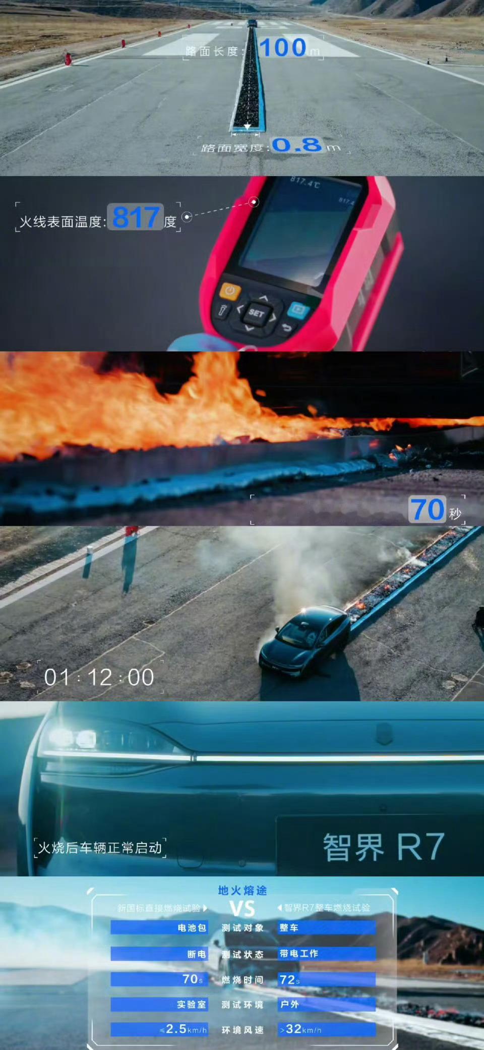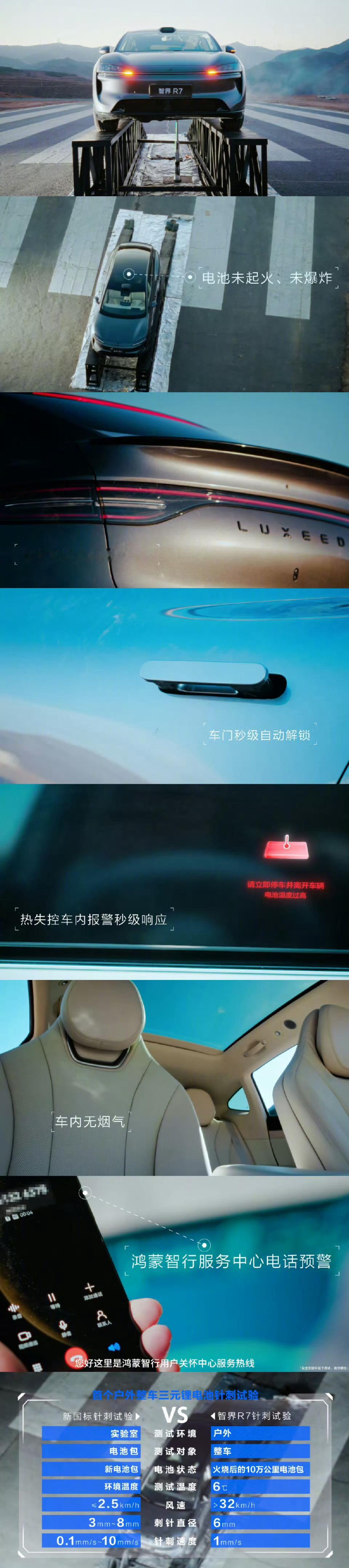 智界R7十万公里电池安全挑战电池安全测试虽然很枯燥,但却至关重要。智界新S7与智界R7搭载的华为巨鲸800V高压电池平台,在十万公里电池健康度测试中,巨鲸电池包依旧保持97%的健康度,按照普通用户一年两万公里的里程算,也就是说开5年还有97%,虽然这里还要叠加使用年限等因素,但这个数据还是挺高的。就像二手平台卖东西这种成色可以写99新了!在极限火焰炙烤测试中,车辆以5km/h速度穿越800℃高温“火龙”长达72秒,超越国标70秒要求,电池包依然稳定无异常。而在三元锂动力电池户外针刺实验中,模拟日常驾驶中异物侵入电池包的危险场景,巨鲸电池在穿刺后仅冒烟、无明火,BMS系统毫秒级响应并联动车内仪表警示、双闪自动打开、门把手自动弹出。这一套组合测试下来看着还挺安全的!
