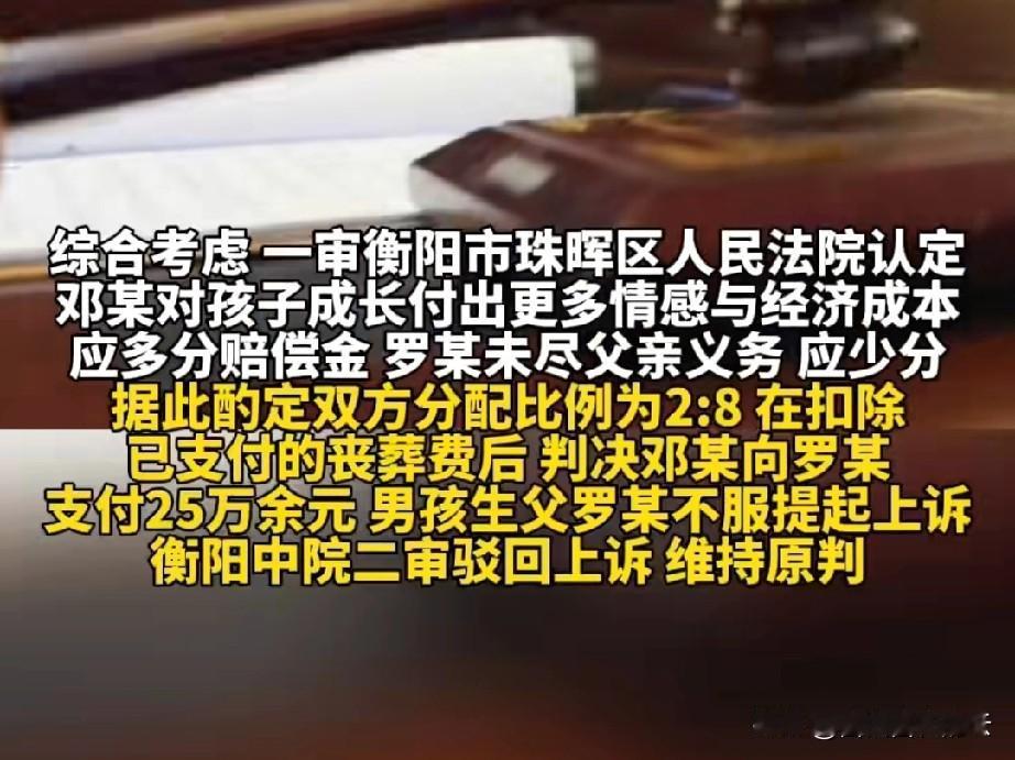 人性啊!湖南,7岁男孩在游泳馆不幸溺亡,游泳馆赔了130万。因为男孩跟随妈妈生活,钱就赔给了妈妈。 爸爸知道这件事后,把妈妈起诉了,他觉得孩子溺亡是妈妈监管不当造成的,所以赔偿款不应该给妈妈,或是只给她一小部分。 男孩家庭条件比较特殊,他父母没有领证就生下的他。男孩出生后,因为父亲长期沉迷赌博,所以男孩一直由妈妈和外公外婆照顾。在男孩身上的花销也是妈妈这边负担的,爸爸从来没给过他生活费。 后来男孩父母分开了,爸爸更是不管不问,抚养费也没出过。就连男孩生病住院他也不去看望。 法院鉴于男孩父亲对孩子没尽到抚养的义务,只有血缘关系,所以酌情判觉赔偿款给他20%,也就是25万。剩余的归孩子妈妈。男孩父亲不服又上诉,二审维持原判。 有网友说,这个男人怎么好意思的?孩子活着的时候不管不问,没了想起来了。我看他就是奔着赔偿金来的,对孩子一点感情也没有。 他想要赔偿金也可以,除非他先把这些年的抚养费给孩子妈妈,他再拿赔偿金。 对于这件事,你怎么看呢?