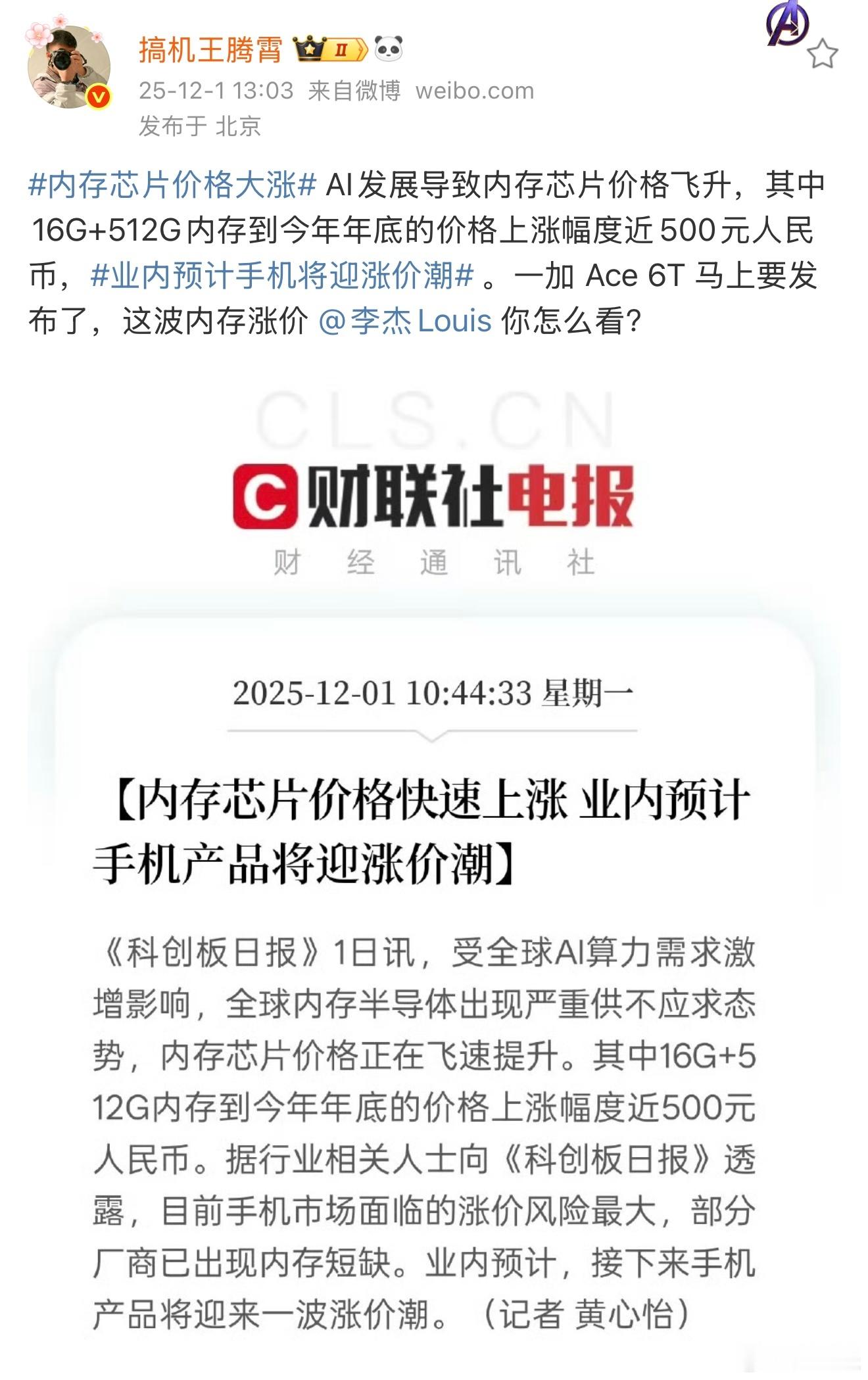 一加 Ace 6T 最大悬念也被曝出来了!2799的起售价,没想到被电商平台抢跑了!不过有一说一,一加Ace 6T这波真的拉满了,搭载当代旗舰芯片骁龙8 Gen5、8300mAh大容量电池、100W快充,支持165无限满帧、满级防尘防水、超声波指纹…...配置放眼同档几乎“不讲武德”。但定价压力也是明摆了,内存芯片价格大涨压力下,昨天李杰回应一加Ace 6T涨不涨价的那句“太难了”,可谓道尽现在手机厂的艰难。一边是成本全线攀升,一边是用户期待“加量不加价”,业内预计手机将迎涨价潮 不再是一句空话。这款原本定位Ace Pro机型的新产品定价究竟能到多少?让我们一起期待下明天发布会!