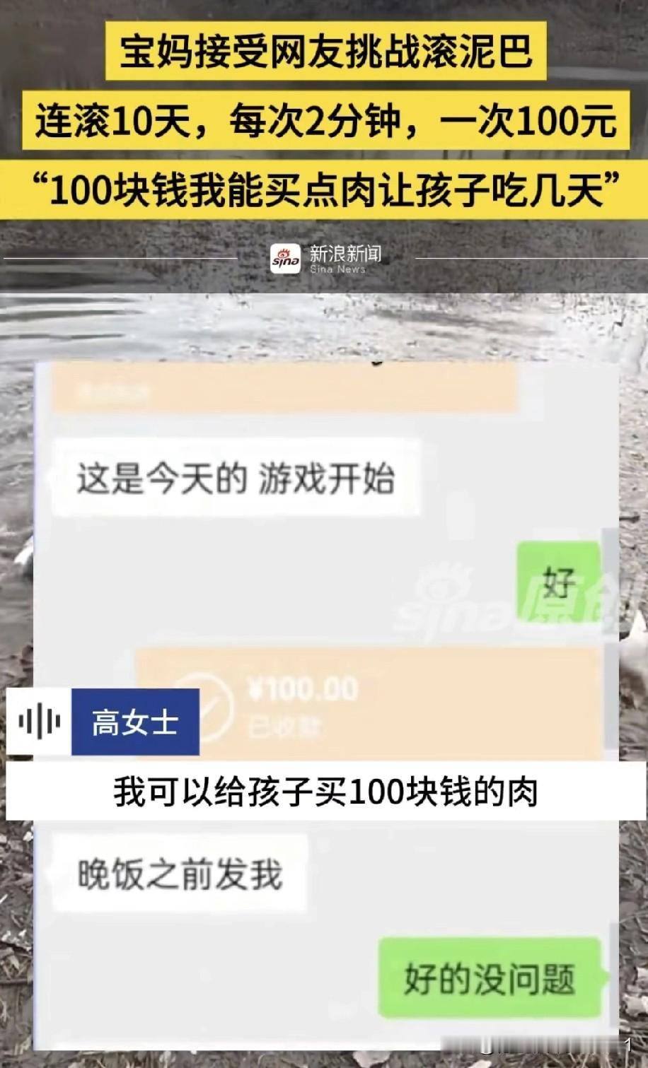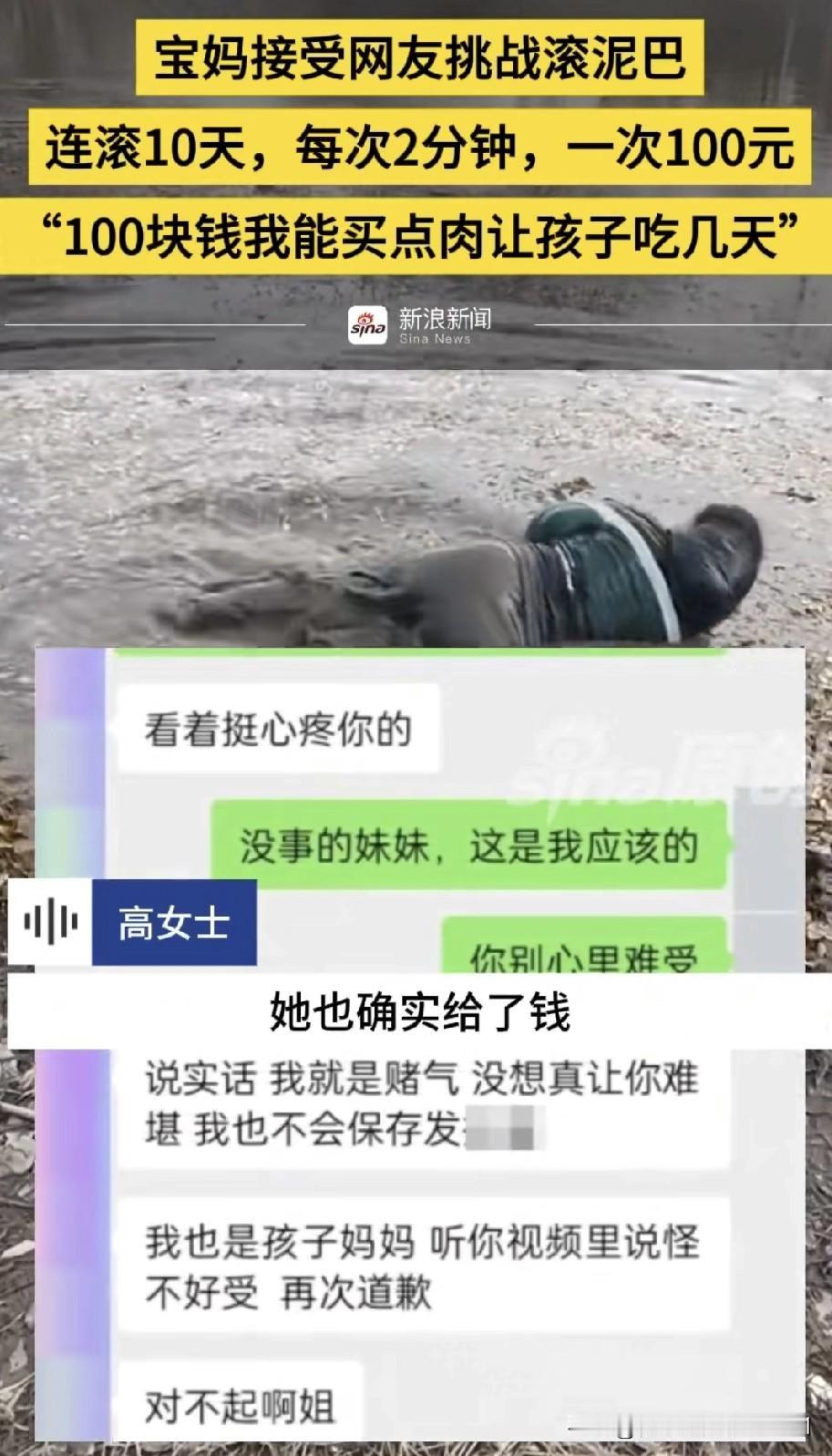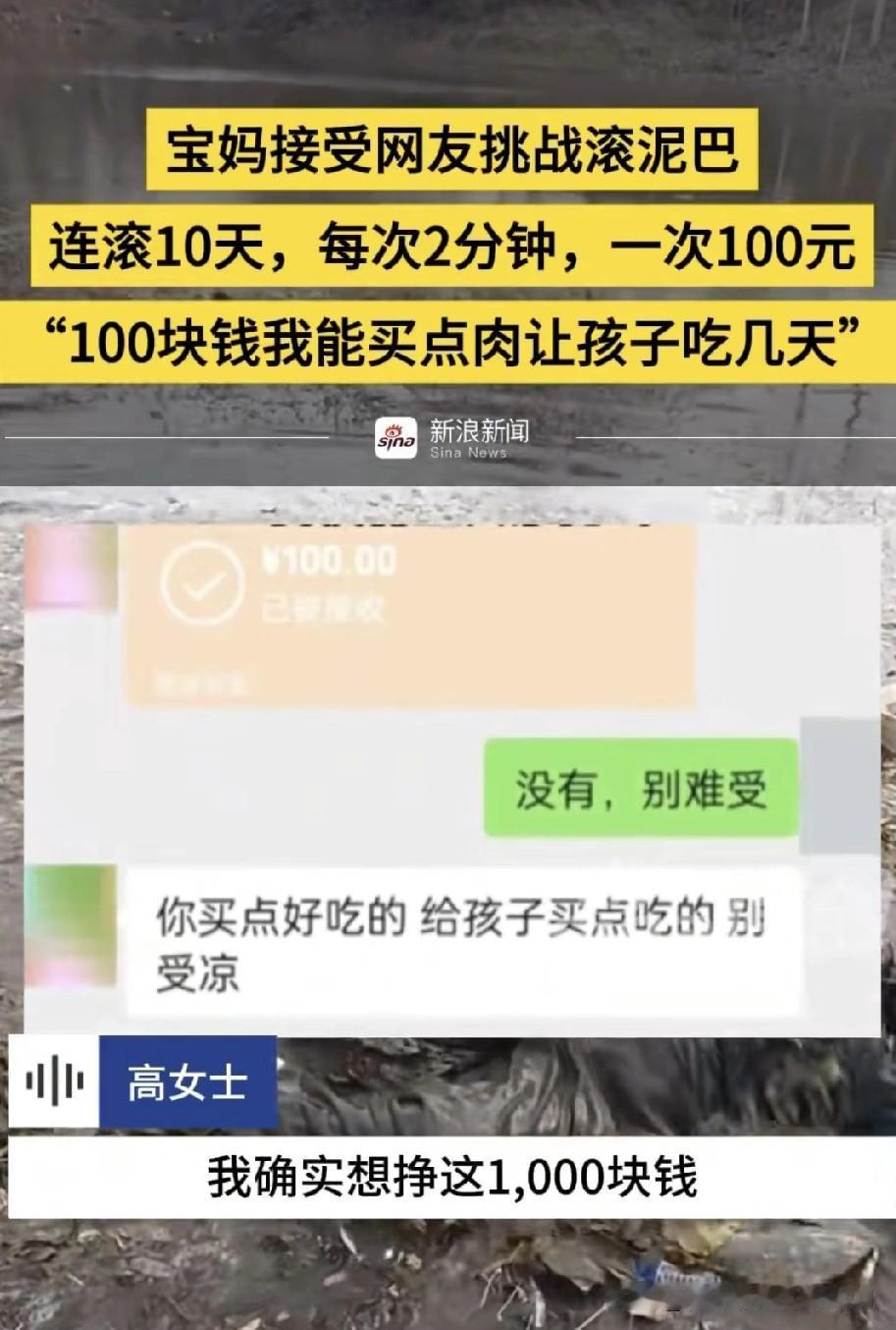 河北邢台一位宝妈刷视频时看见一位男子在泥巴里滚,宝妈在评论区留言如果有人愿意给自己100元自己也愿意滚,没想到真有人回复了,愿意出钱让宝妈滚泥巴,二人商量好,滚泥巴十天一天两分钟,一次100元,宝妈想着赚100元可以给孩子买肉能吃好几天,宝妈讲述自己家,一胎是儿子,二胎来了双胞儿子,生活压力大,宝妈把自己滚泥巴录的视频发给回复留言那女子,他也没想到宝妈真的滚泥巴,但也没有失信真的给宝妈转了钱,还道歉了,关心宝妈别着凉了,宝妈表示自己确实想赚这1000元。没有什么不好意思的。