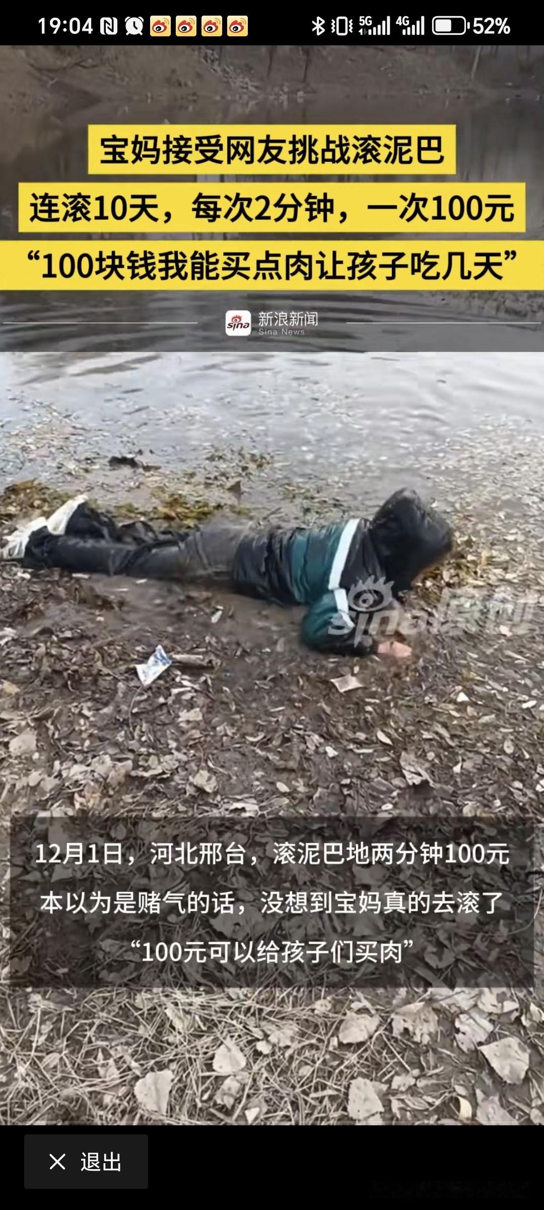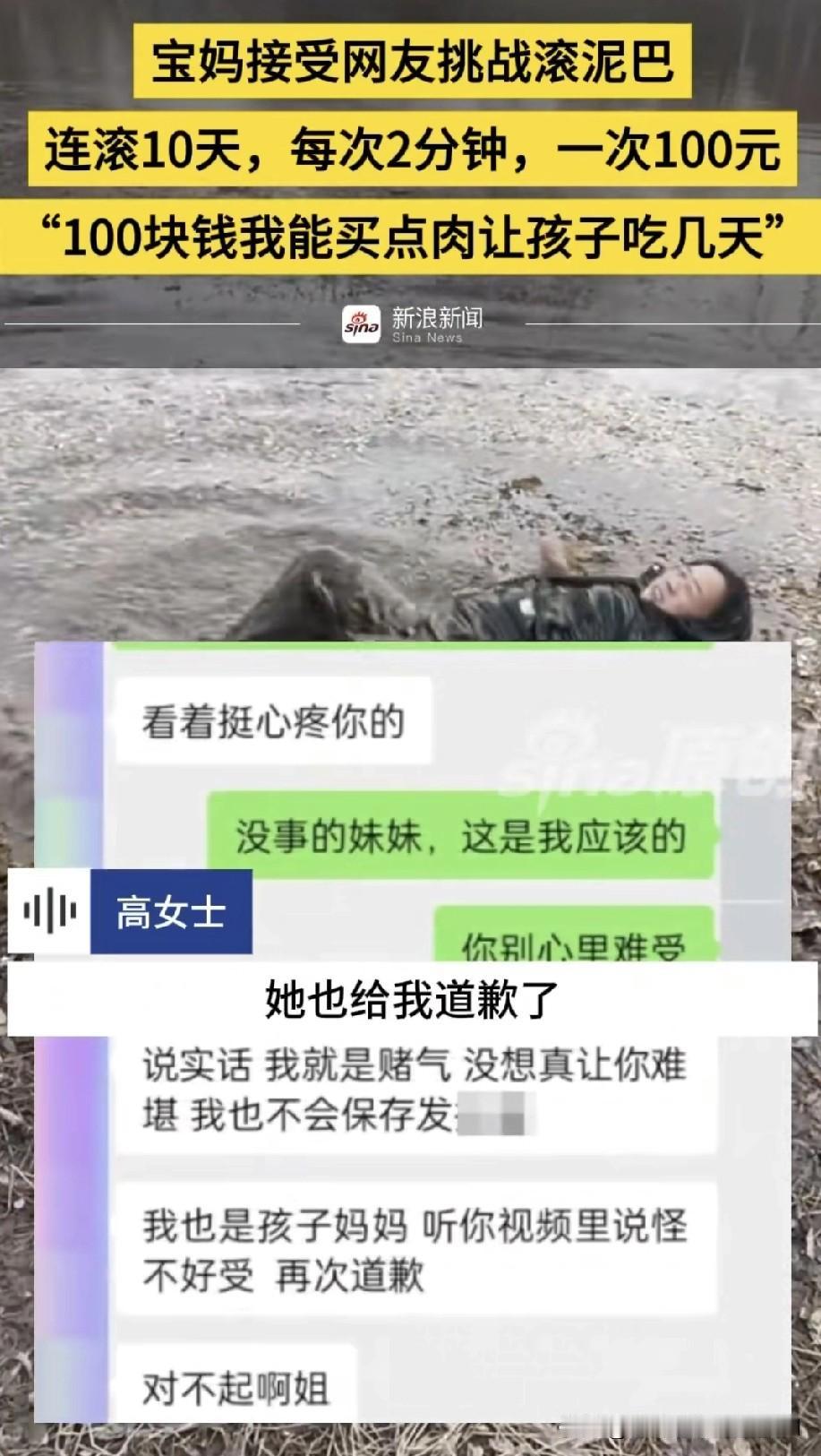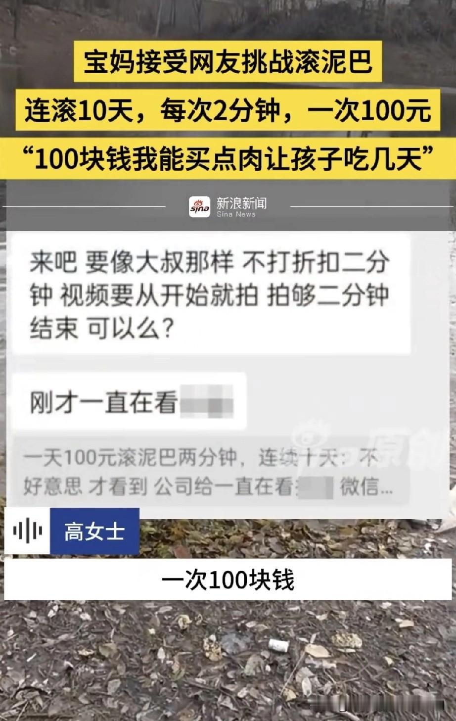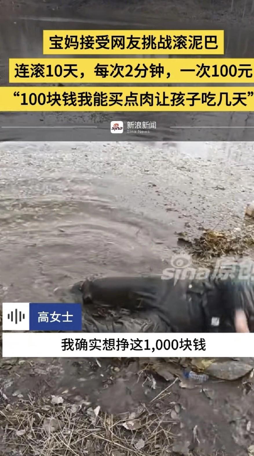 河北邢台一位宝妈刷视频时看见一位男子在泥巴里滚,宝妈在评论区留言如果有人愿意给自己100元自己也愿意滚,没想到真有人回复了,愿意出钱让宝妈滚泥巴,二人商量好,滚泥巴十天一天两分钟,一次100元,宝妈想着赚100元可以给孩子买肉能吃好几天,宝妈讲述自己家,一胎是儿子,二胎来了双胞儿子,生活压力大,宝妈把自己滚泥巴录的视频发给回复留言那女子,他也没想到宝妈真的滚泥巴,但也没有失信真的给宝妈转了钱,还道歉了,关心宝妈别着凉了,宝妈表示自己确实想赚这1000元。没有什么不好意思的。