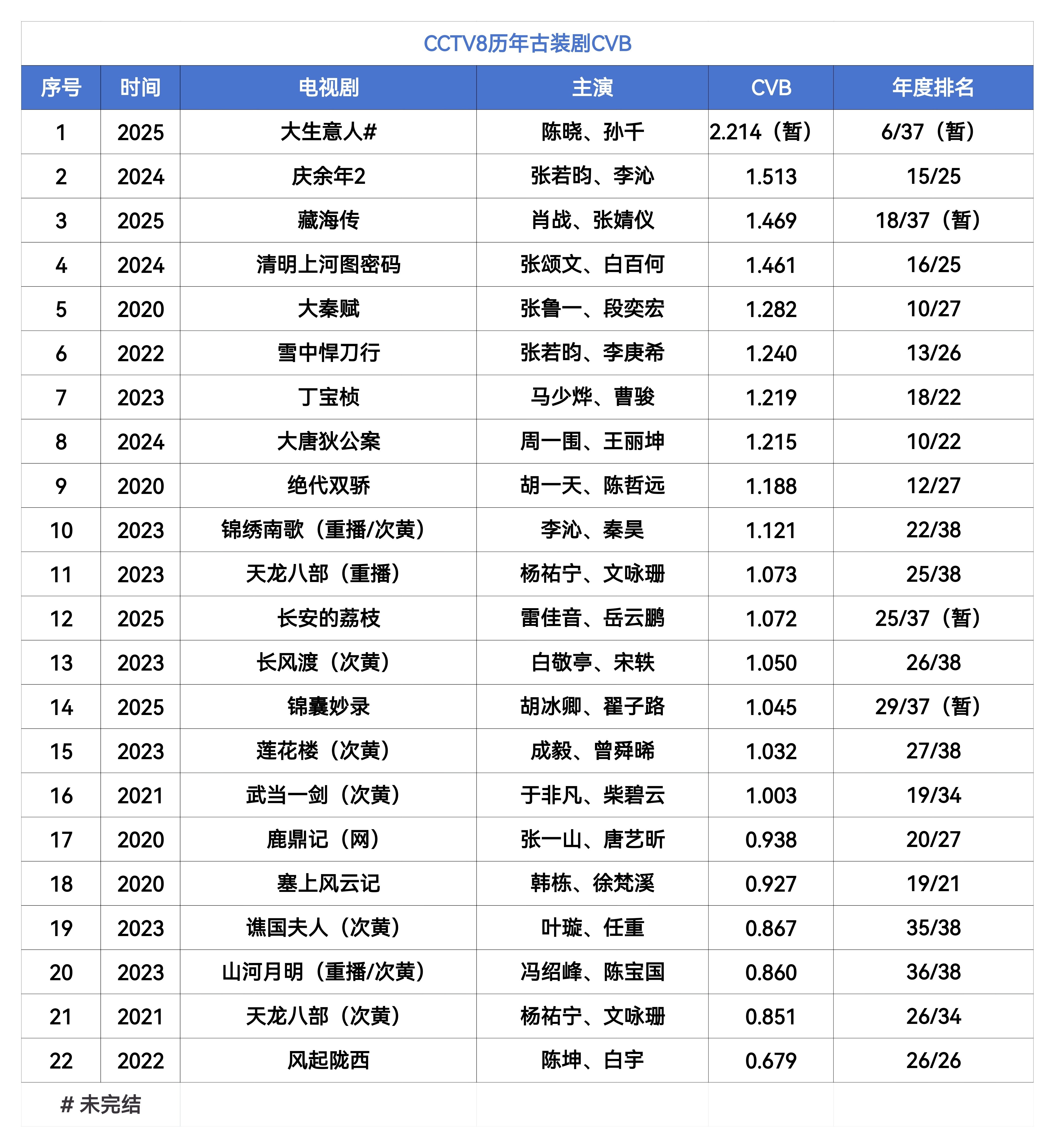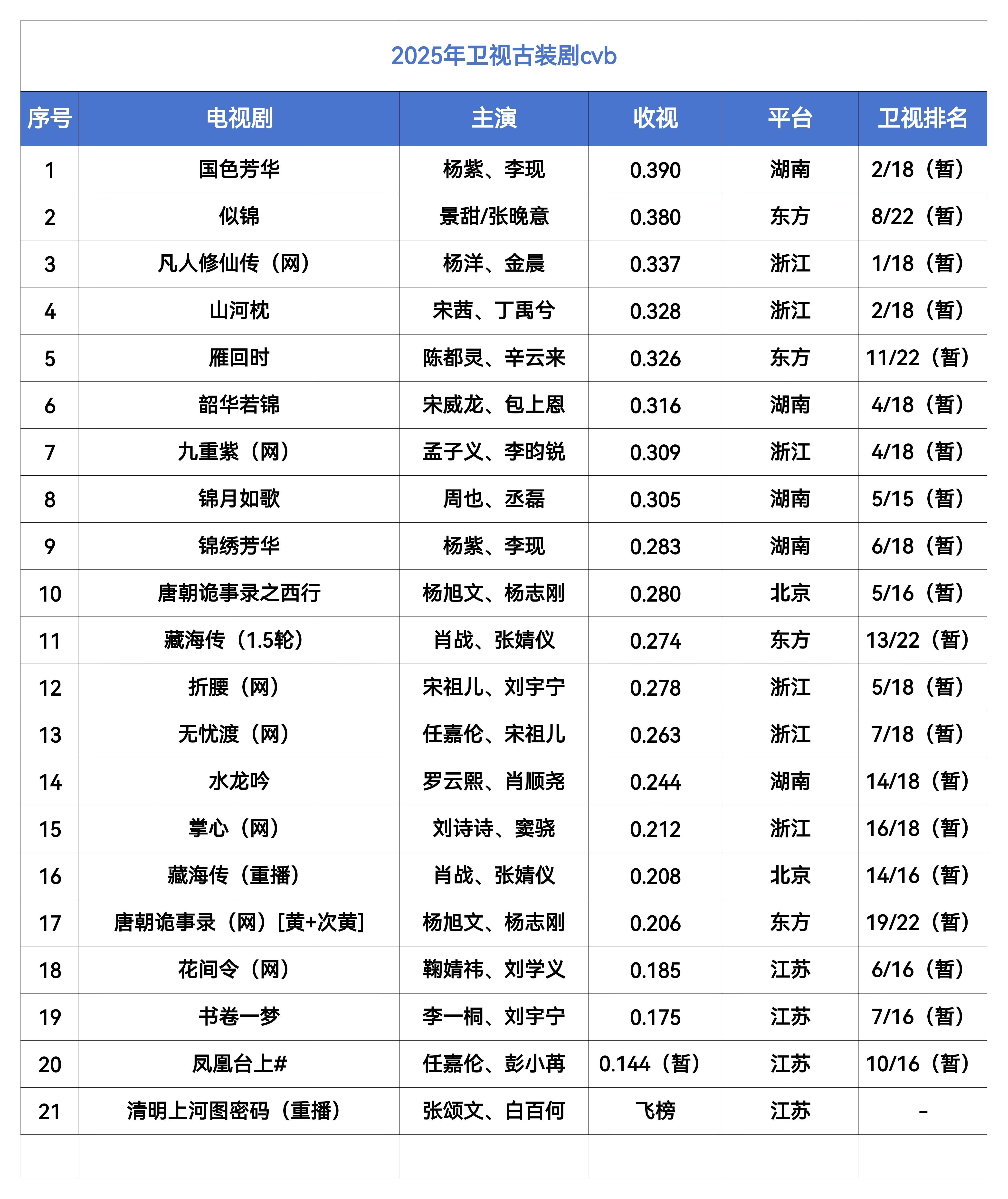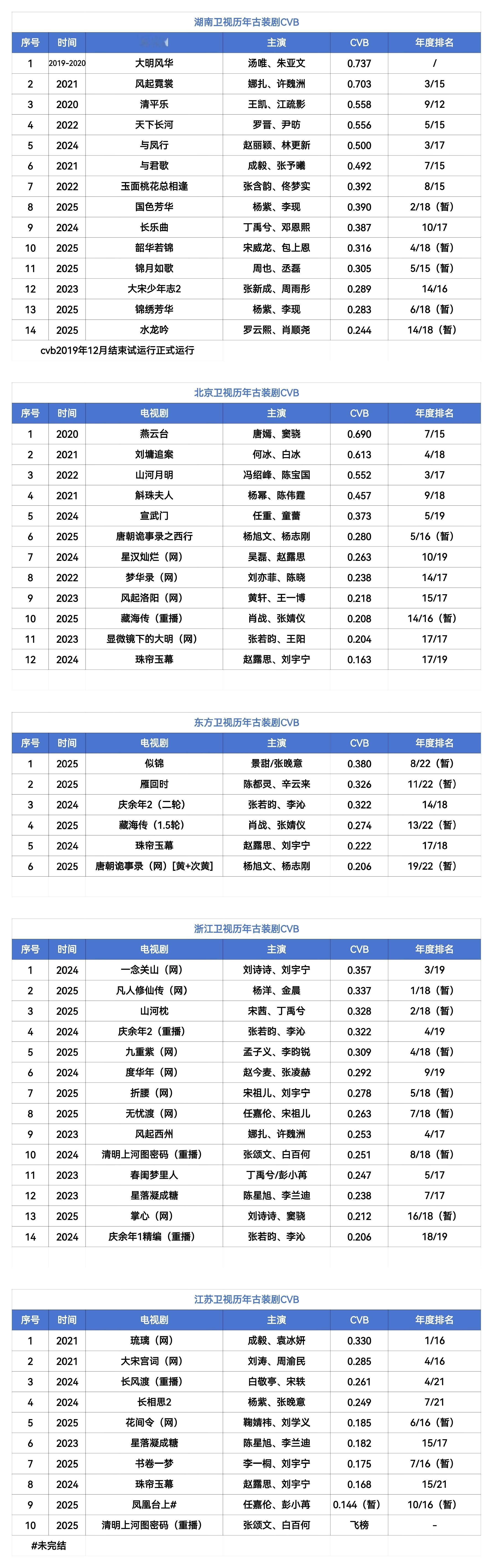 有人说古装剧收视央视越来越高不断刷新榜一, 卫视古装收视越来越低不断刷新榜尾。央一央八近两年cvb不断扩容,开机就是央一。其实不管古装还是现代cvb都是央视越来越高,卫视越来越低......然后冬天高夏天低......