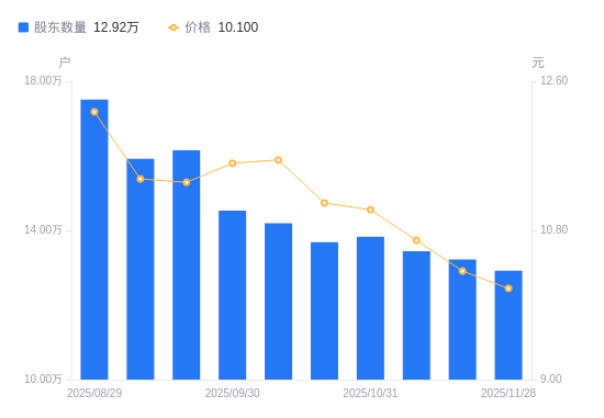 日期A股户数(户)流通A股户均持股数(股)户均持股市值(万元)2025-11-2812918227888.2528.172025-11-2013217927255.9228.102025-11-1013439726806.1028.632025-10-3113833426043.2028.782025-10-2013682926329.6529.302025-10-1014192025385.1429.572025-09-3014529224795.9928.792025-09-1916149622308.0425.392025-09-1015918622631.7625.852025-08-2917508320576.8725.17