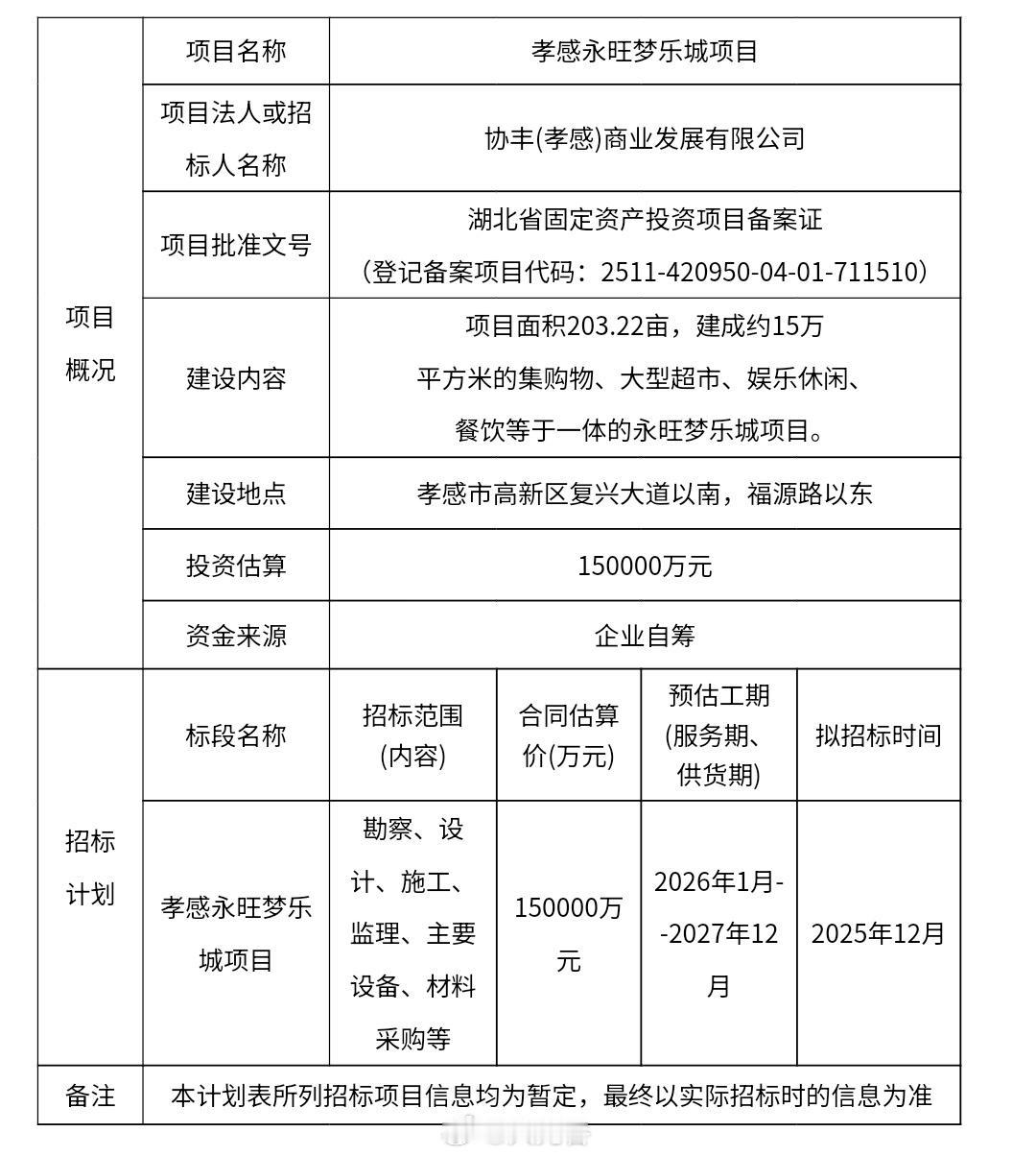 孝感永旺梦乐城项目招标计划发布! 11月28日,湖北招投标电子交易平台发布了孝感永旺梦乐城项目招标计划。项目面积203.22亩,建成约15万平方米的集购物、大型超市、娱乐休闲、餐饮等于一体的永旺梦乐城项目。投资估算15亿。建设期为2026年1月--2027年12月。 24年12月5日,2024年四季度湖北省重大项目集中开工活动之孝感市分会场设在高新区举行。其中,孝感市永旺梦乐城购物中心项目宣布正式开工。孝感永旺梦乐城购物中心位于复兴大道以南,福源路以东,董永一路以北,用地面积约206亩,总投资约15亿元,永旺集团还是延续轻资产整体租赁方式在湖北开店。