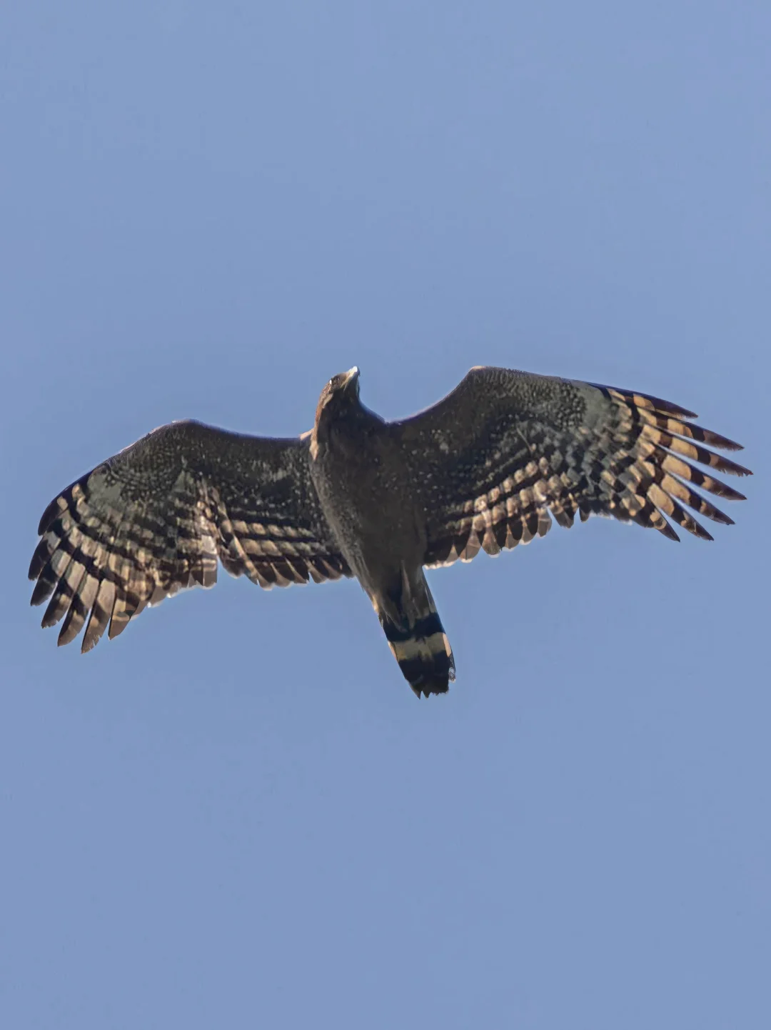 原创拍摄于2025.05 蛇雕,Crested Serpent Eagle,鹰形目鹰科蛇雕属。国家二级保护动物。蛇雕其实在我国南部还是不难见到,有一部分是我国南部的留鸟,还有一部分是迁徙的候鸟,繁殖季会到我国偏北的地方。蛇雕也是迁徙经过重庆数量最多的雕,但雕类总归是非常稀少的。 蛇雕鲜黄的眼前裸皮和羽毛纹路特征明显。而这次看到的这只蛇雕从羽色看还是第2年的未成年鸟,非常的年轻,正青春漂亮。 重庆猛禽迁徙高峰季快要进入尾声了,雕类也越来越少了。