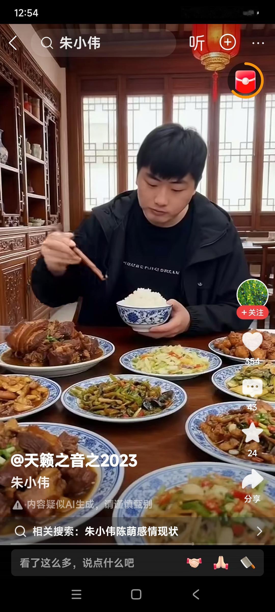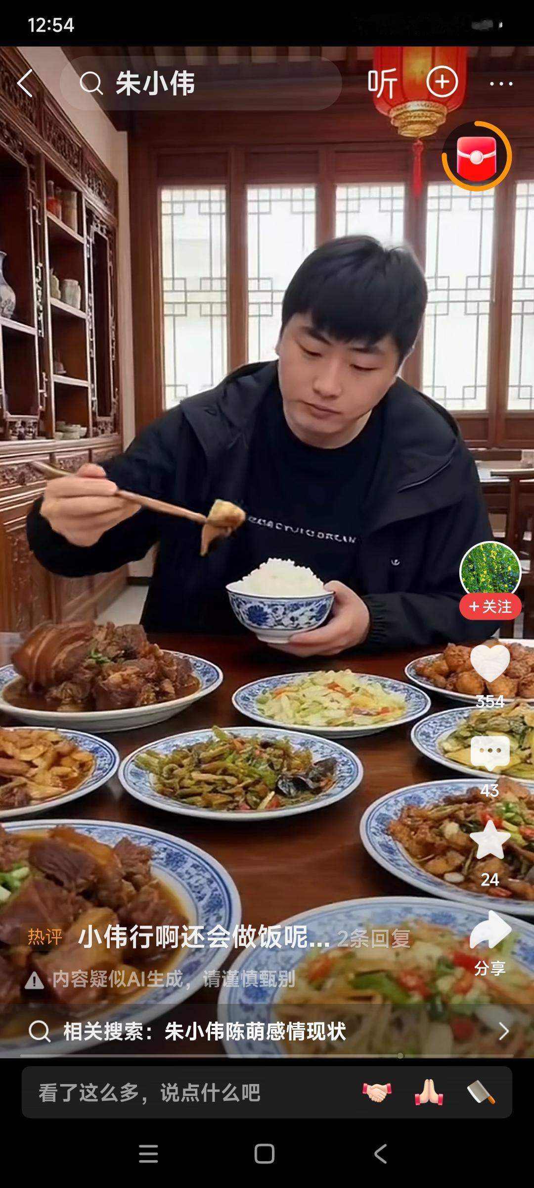 我说朱小伟是一个聪明的孩子,你们信不信? 别的不会干,下厨炒菜还是一把高手。 你们看这一桌子菜。 不是高手,能炒出来这么一桌子菜吗? 朱小伟跟他爸爸一样,自个儿吃饭,也整了一桌子多少个菜。 有钱人家的孩子真厉害呀。