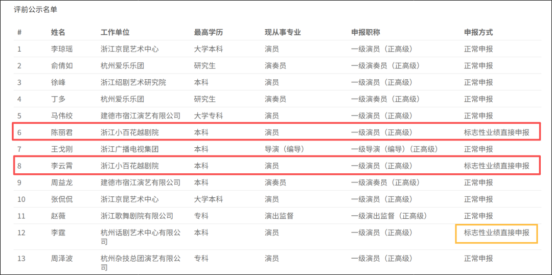 而他与陈丽君、李云霄的申请方式也一致,为“标志性业绩直接申报”。根据《浙江省艺术系列专业技术职务任职资格评价条件》显示,获得全国性文艺奖项(文华奖、白玉兰奖等),可破格申报。