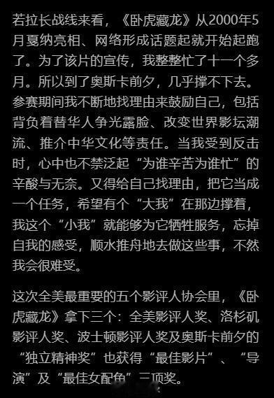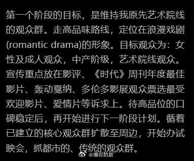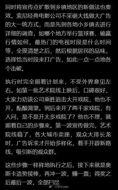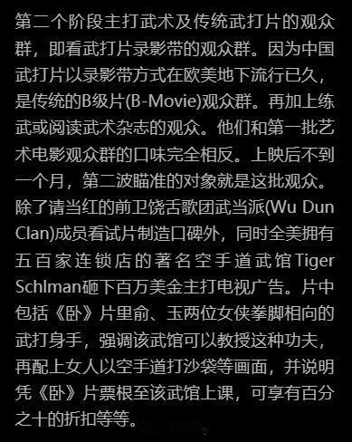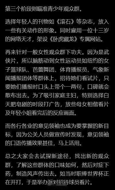 被卧虎藏龙的宣发策略惊呆了人群抓得非常精细有层次,除了联名还有KOL,甚至核心人群外的小镇用户偏好都做了调查,不断吸引新的观众群体,稳扎稳打,聚沙成塔。如此商业化,成功将一部东方武侠片打入美国主流电影市场。感觉李安自己都要累死了,不是你们当导演的怎么什么都干啊内容来源:《 十年一觉电影梦 李安传》章节:奥斯卡