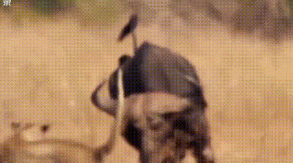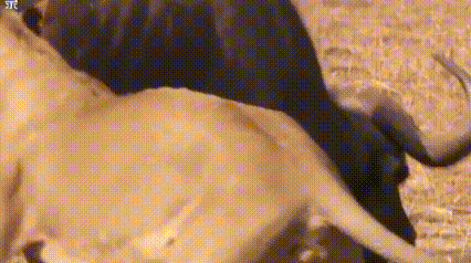 水牛独自外出觅食,不知不觉穿过狮群的领地。 几天来连续高温,猎物稀少,狮子们忍饥挨饿。眼前突然出现一头掉队的水牛,狮子们犹如看到了近在咫尺的牛肉大餐。 这样的机会岂能放过,两头狮子率先发起进攻。但水牛岂能乖乖就擒?即使脱离牛群,单个的非洲水牛也是强大的对手,尖锐的牛角能置狮子于死地。只见水牛跳跃旋转,不断化解狮子的进攻。 眼看两只狮子不敌,第三只狮子也加入了战斗,终于制服了猎物,似乎胜券在握。 然而让狮子始料未及的是,这只强悍的猎物并不打算放弃,心甘情愿成为被宰的羔羊。凭借顽强的毅力终于挣脱了狮子们的尖牙利爪,站了起来。 局势逆转,对峙20分钟后,强烈的高温已让狮子们疲惫不堪,无心再战,只好放弃。非洲水牛凭借超凡的耐力给战斗画上了句号。 水牛重获新生,它高昂着头,晃动着胜利的尾巴,向着远去的牛群奔走。