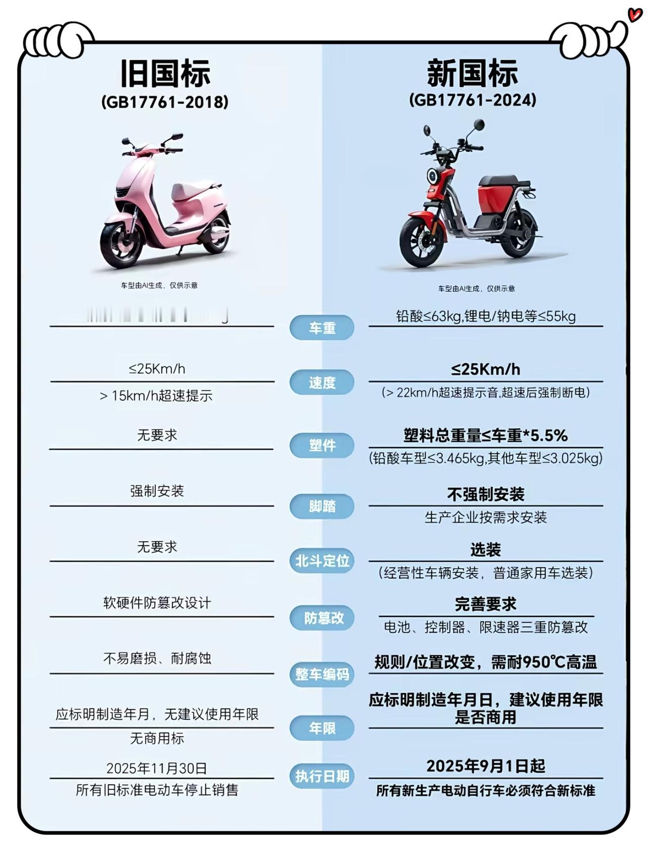 一张图告诉你新新国标和新国标区别 新新国标电动车是谁设计的? 看了一下跟新国标的区别: 1、限速25km/h+阻燃材料+短制动距离,爬坡能力更强 2、续航多15-20km 3、取消强制脚踏不打腿 4、一车一码防改装 5、坐垫缩短 感觉新新国标还是有好处的,对于九号电动这种大厂估计还挺利好的,你会入手新新国标电动车吗?