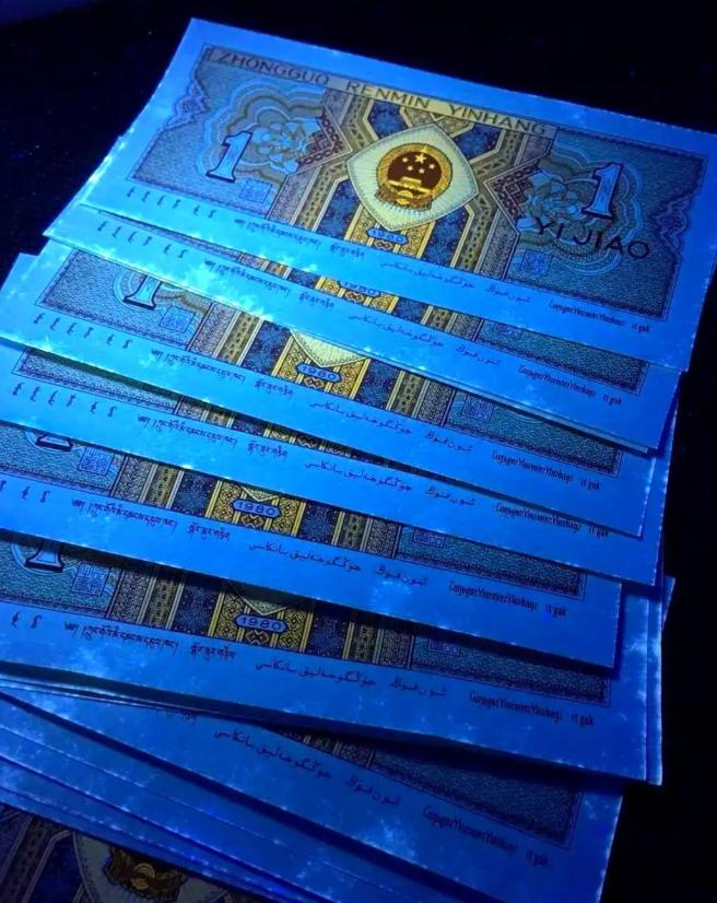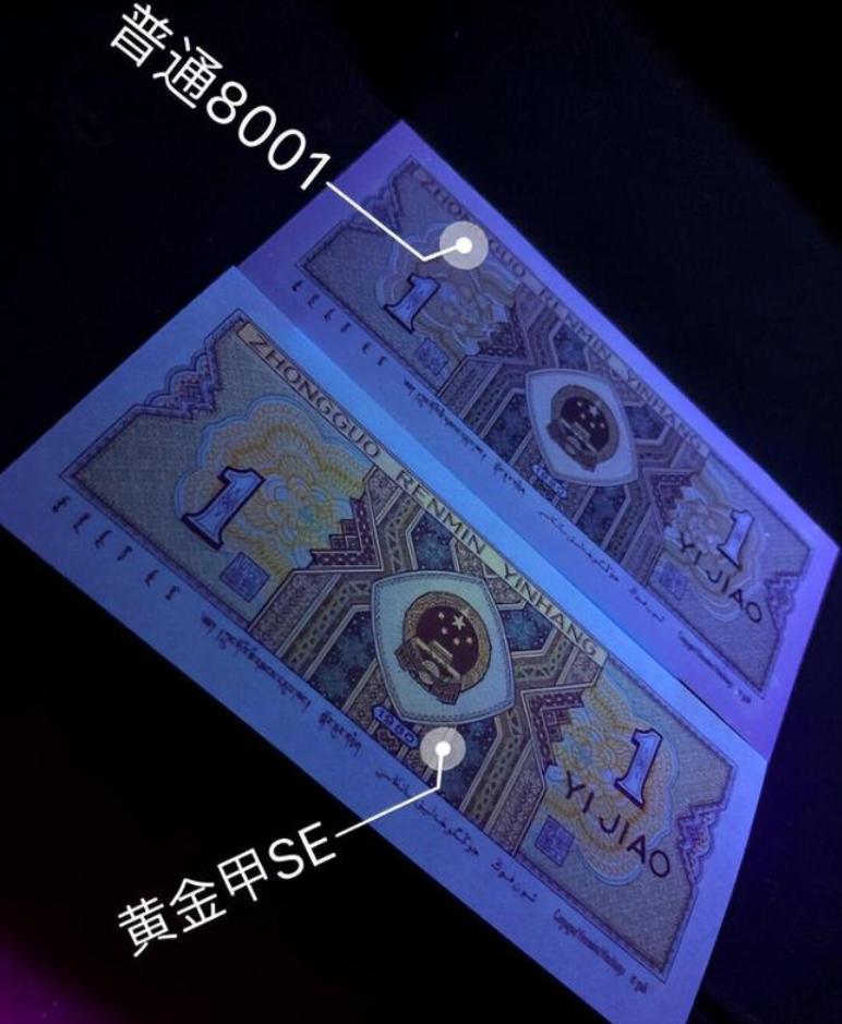 一毛钱也能卖出7700元的高价?别当废纸,有这种发光的很值钱! 作为第四套人民币里的最小的面值纸币(分币属于第三版),1980年版的1角纸币(8001)现在的处境确实挺尴尬。虽然第四套人民币在2018年就宣布大面积退市了,但1角和5角为了方便找零,依然还在市场流通,并没有退市。 所以因为量大、没彻底退市,导致现在市面上普通的全新8001,回收价也就在0.15元左右。对于想发财的人来说,这跟没有一样。 但是,收藏圈永远不缺奇迹。今年香港拍卖会上,一包看似普通的80版1角纸币,竟然拍出了1080美元的价格,换算成人民币也就是7700多元。这一包一角的面值是1000元,成交价是7700元,整整翻了7倍。是什么原因让不起眼的一毛钱身价倍增? 很多人觉得纸币就是印刷品,长得都一样。但其实在第四套人民币的印制过程中,为了探索更高科技的防伪技术,印钞厂悄悄地在部分纸币上进行了荧光防伪试验。 80版1角作为面额最小、成本最低的券种,成了最佳的“试验品”。 壹角纸币里面最著名的品种,叫黄金甲。 普通的8001,你在荧光灯下看就是一张纸。但如果你拿紫外线灯照这种特殊的黄金甲一角钱,那你就会发现: 纸币背面的国徽图案以及两侧的花纹,会发出耀眼的金黄色荧光,就像身披黄金铠甲的武士一样,视觉效果极为漂亮。 这种特殊的光芒,不是为了好看,而是当年国家顶尖防伪技术的结晶,是防伪油墨和特种纸张的完美结合。 既然黄金甲荧光这么值钱,那是不是只要发光就值钱?非也!收藏也讲究一个“等级”。 市场上的黄金甲版别分为弱荧光、中强荧光和特强荧光三个等级。 那种稍微带点光亮、看起来灰扑扑的“弱黄金甲”,因为存量太大,几乎没有太多收藏价值,价格也就比面值高一点点。真正能卖上价、让藏家抢破头的,是那种特强黄金甲。在灯光下金光灿灿,通体透亮,这种黄金甲的稀缺度非常高。 要想找到这种宝贝,不用真的拿灯一个个照,只要看冠号(纸币左下角的两个字母)就能找到。 老孟给大家整理了一份冠号清单,大家可以拿小本本记下来: WN、WO、YK、YL、YM、YN、QL、QM、TE、DQ、TG、RL、AL。 这13个冠号里,包含着黄金甲最核心的号段。特别是WN83、WO03这些特定流水号开头的,更是特强黄金甲的集中营。据统计,特强版本的总存世量大约只有1700万张,分摊到全国十几亿人手里,能遇到一张就是缘分。 其实除了黄金甲,8001这个品种里还有很多好玩的荧光版别。 比如“青天白日”,在荧光灯下呈现出蓝白色的清冷光感; 比如“蓝天瑞云”,荧光纹理像云朵一样祥瑞。 这些品种虽然名气没有黄金甲那么大,但也有一群人专门在收集。它们的价值都基本是一样的。 与其去买那些动辄几万几十万的大黑十、背绿水印,不如在这些小面额的荧光币里找找乐趣。 几块钱一张的成本,就能欣赏到那时候工业艺术的极致美感,而且还有稳定的增值空间,这才是适合大众的“快乐收藏”。
