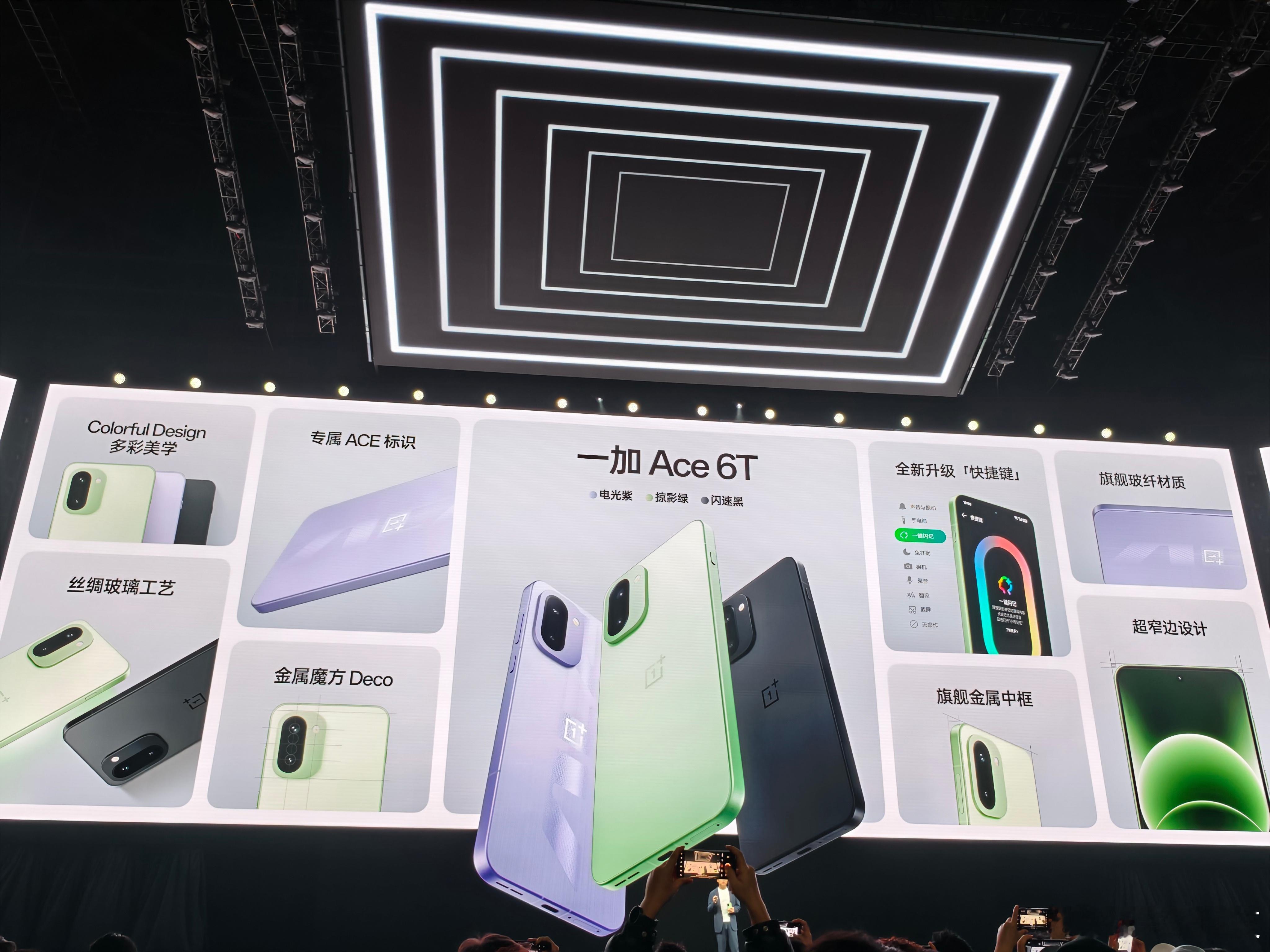 性能旗舰新选择来了 一加Ace6T正式发布!「掠影绿」、「电光紫」、「闪速黑」三款配色+简洁设计风格,还有圆润R角和微弧金属中框,手感一绝~性能方面搭载全球首发的第五代骁龙8旗舰芯片,由一加和高通联合研发、优化,全面沿袭第五代骁龙 8 至尊版的实力,采用第三代3nm制程工艺,第三代Oryon CPU 架构和最新一代Adreno GPU,拥有超强性能与能效,性能稳居行业第一梯队。还有一加独家新一代「风驰游戏内核」加持,配合自研潮汐架构与极光引擎,确保游戏与日常使用全程流畅。屏幕方面搭载和一加15同款的Ultra级165Hz极速高刷屏,还官宣行业独家首发《和平精英》原生165Hz 高刷新帧率模式旦用难回~至于其他配置,一加 Ace 6T搭载8300mAh冰川电池,还支持旁路供电、有线反充等众多实用功能,拥有目前行业最全的IP66/68/69/69K防尘防水“大满贯”认证。影像方面,一加 Ace 6T搭载支持IOS光学防抖的5000 万像素的索尼 IMX906大底旗舰主摄,旗舰同款的“超清画质算法”、“超光影图像算法”、“人像引擎”、无影抓拍、超清实况照片、AI 人像补光、AI 消除等一手抓这旗舰确实不一般