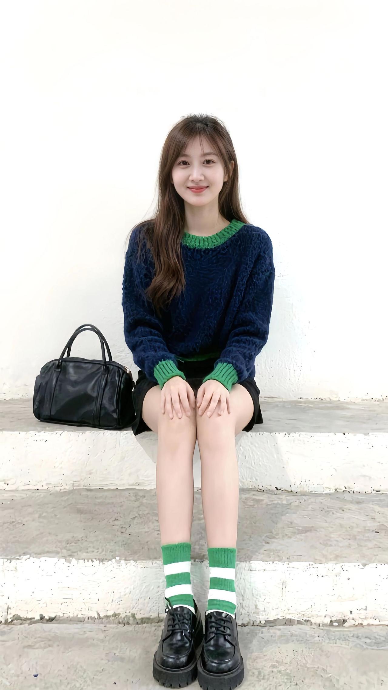 清新校园风穿搭,绿色条纹袜搭配黑色皮鞋,青春活力满满!