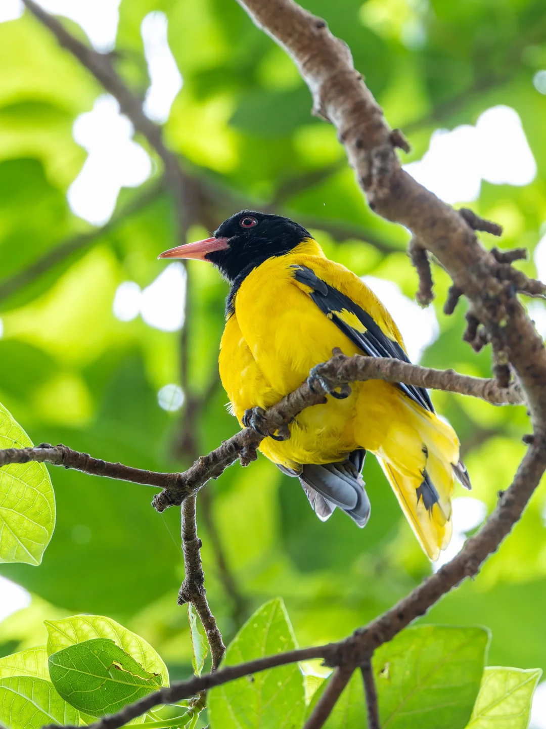 原创拍摄 黑头黄鹂,Black-hooded Oriole,雀形目黄鹂科黄鹂属,是一种分布在南亚到东南亚热带地区的黄鹂,在我国是边缘分布,只在云南西部的能看到,5月前可能比较稳。 黑头黄鹂和我们常见的黑枕黄鹂大致相似,不过它们有黑色的头部和胸部,黑金色彩搭配更加明确。