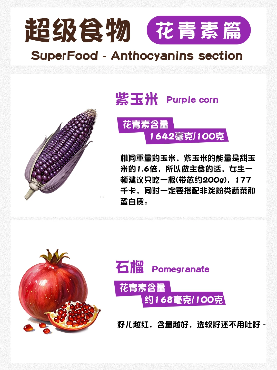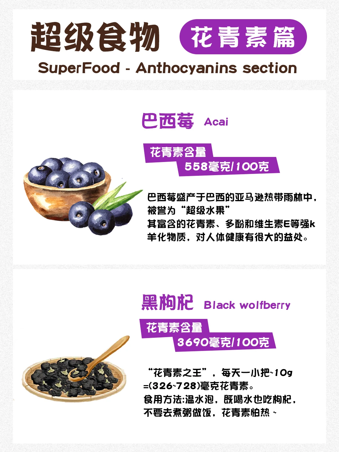 今天要给你们种草一波超级食物界的k羊化明星——花青素大集合!💖 让你从内到外散发自然光彩,逆龄生长不是梦哦! ✅巴西莓 ✅黑枸杞 ✅紫玉米 ✅石榴 ✅紫甘蓝 ✅深色樱桃 ✅蓝莓 ✅黑米 ✅葡萄 ✅紫薯