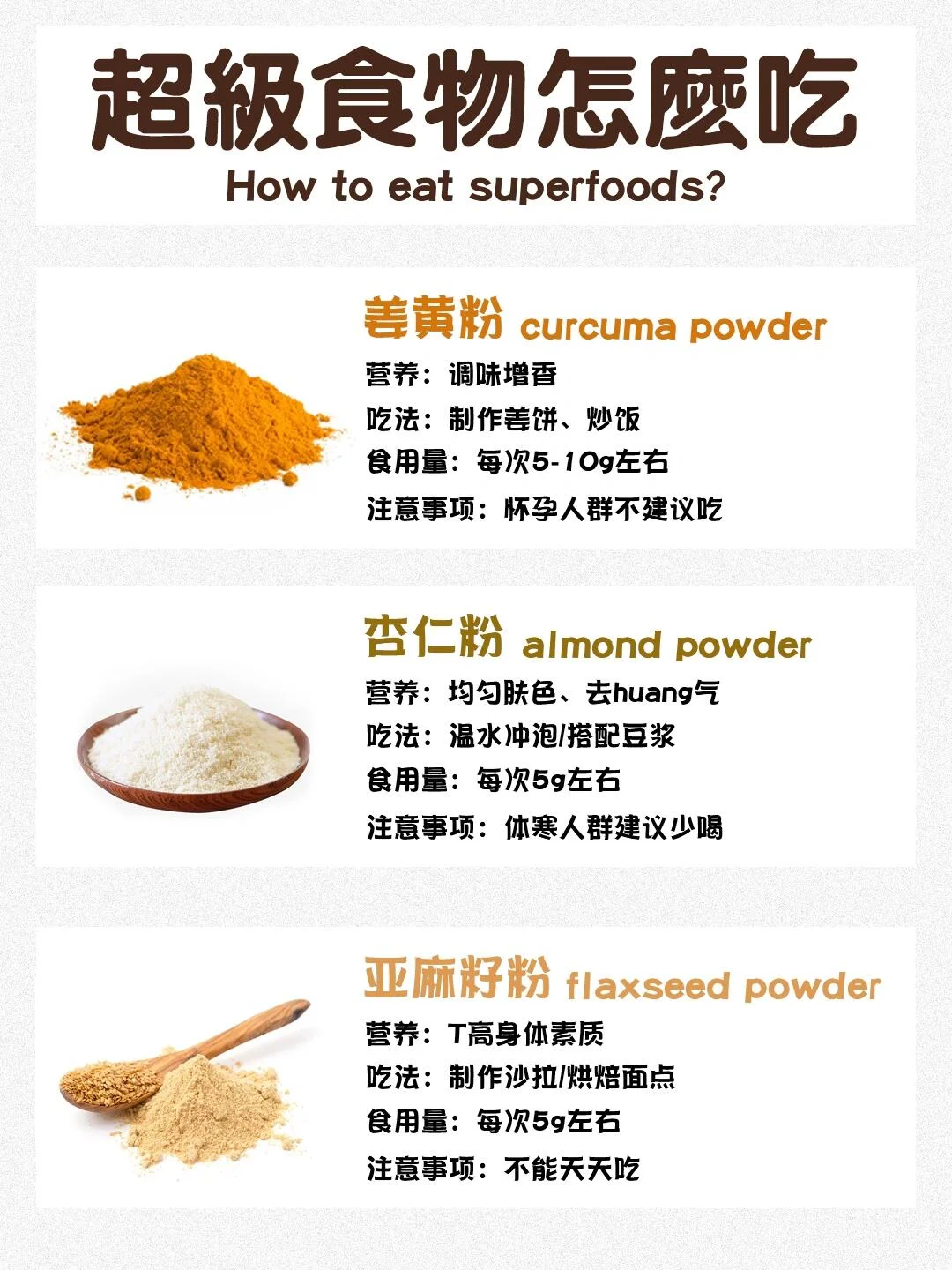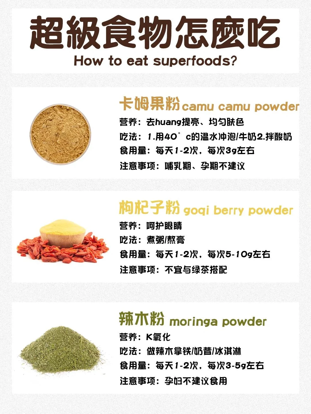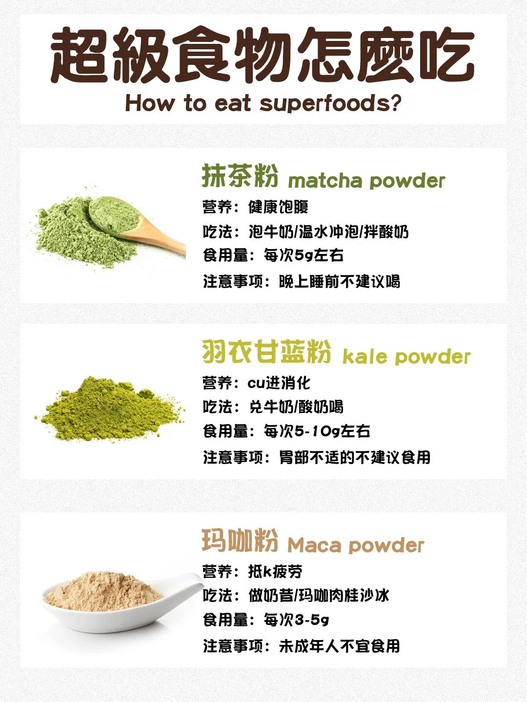 超级食物粉粉🔥食用方法✔分享几款比较热门的超级食物粉粉[蹲后续H] ✅生可可粉 ✅巴西莓粉 ✅甜菜根粉 ✅姜黄粉 ✅杏仁粉 ✅亚麻籽粉 ✅抹茶粉 ✅羽衣甘蓝粉 ✅玛咖粉 ✅卡姆果粉 ✅枸杞子粉 ✅辣木粉