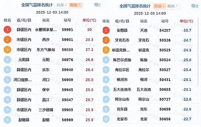 而在降温不明显的广东、海南等地,午后气温还在20℃以上。海南三沙的永暑站甚至达到30℃,与吉林长白山天池-33.7℃形成鲜明反差,同一天我国南北温差超过了60℃。