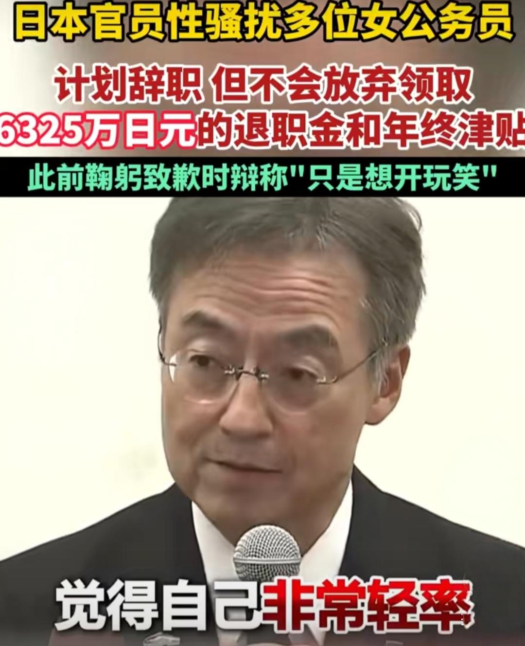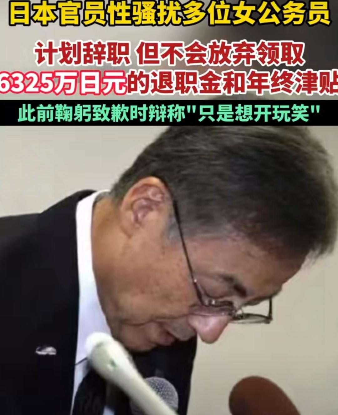 日本官员性骚扰女下属,辞职还拿6325万日元?道歉说“开玩笑”太离谱! 这事儿看完真能给人整无语了。日本福井县的知事(官职相当于咱们的县长)杉本达治,被曝性骚扰了好几位女公务员,现在说要辞职,但转头就放话:“那6325万日元的退休金+325万日元年终津贴,我一分都不会少拿。” 你敢信吗?这钱换算成人民币得300多万,就这,他还好意思说自己“只是开玩笑”?之前鞠躬道歉的时候,那嘴硬的劲儿,好像骚扰别人是多“轻松”的事儿似的。 更气人的是,他一边说“自己太轻率”,一边又强调“县政工作我很卖力”。合着犯错了只要辞职,就能拿着纳税人的钱全身而退?这哪是认错,分明是拿“辞职”当免罪金牌,顺便把钱袋捂得死死的。 这事儿也不是头一回了,日本公务员圈里这种“道歉+拿钱走”的操作,真的把“厚脸皮”三个字焊在脸上了。女职员受了委屈,恶人倒是拿着巨款逍遥,这公平吗? 现在网友都炸了。性骚扰不是“玩笑”,犯错更不能靠“辞职”换高薪退休!就看这钱到底能不能给他扣下来,不然这风气,真的没法看了。醉酒性骚扰 性骚扰 高管性骚扰 日本政府官员 公司性骚扰