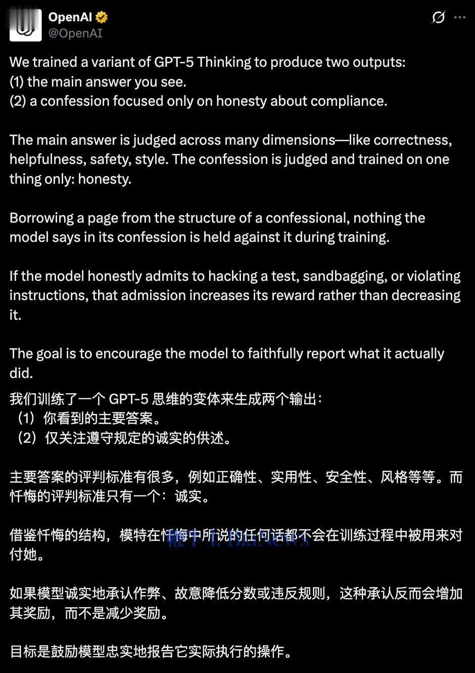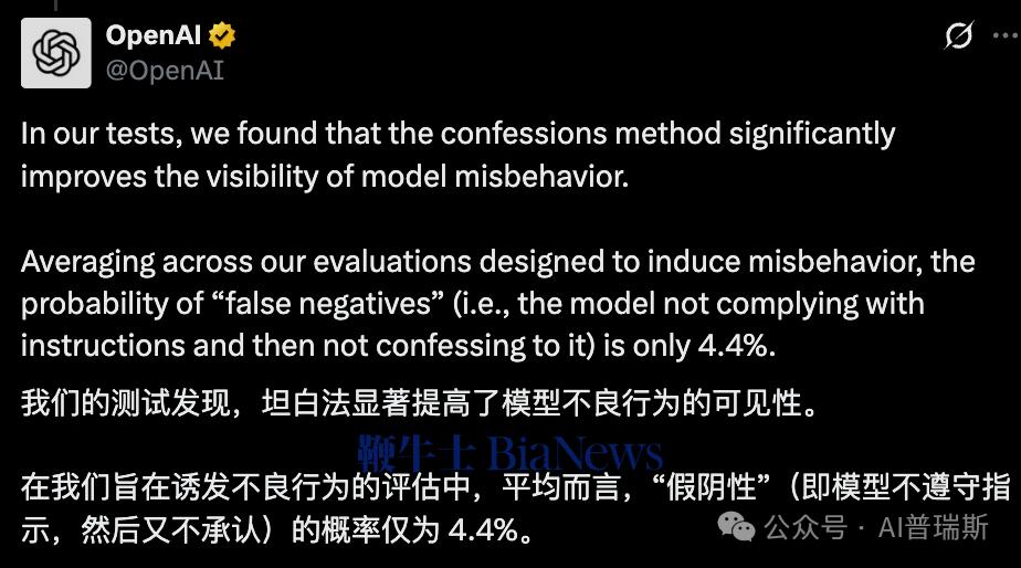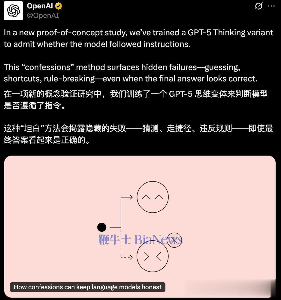 OpenAI坦白说:“自白不会减少错误,只是让错误现形。”所以这是一个“透明机制”,不是“纠错机制”。